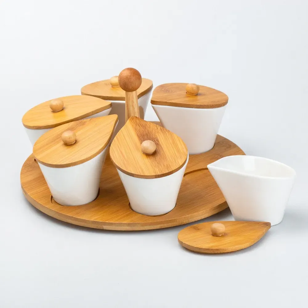 Набір керамічних баночок для приправ з ложкою та бамбуковою кришкою 6 шт (HP258)