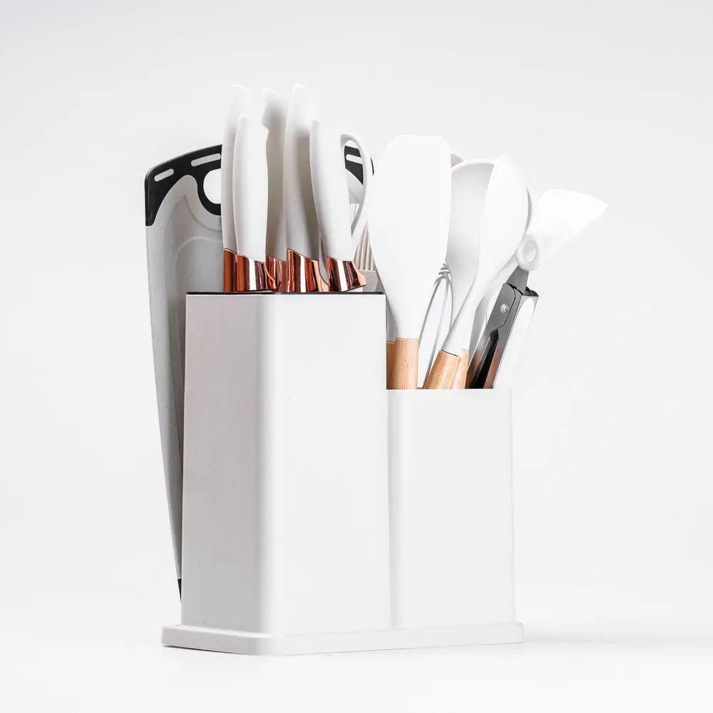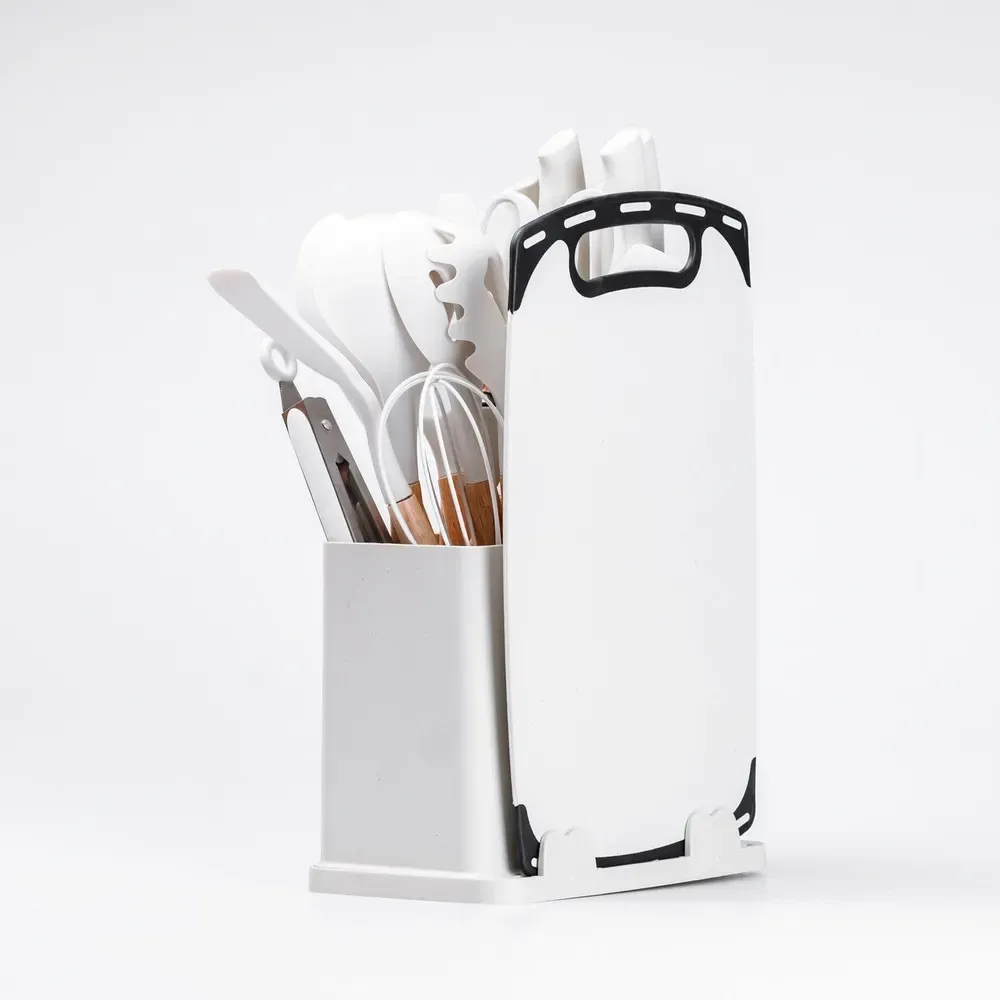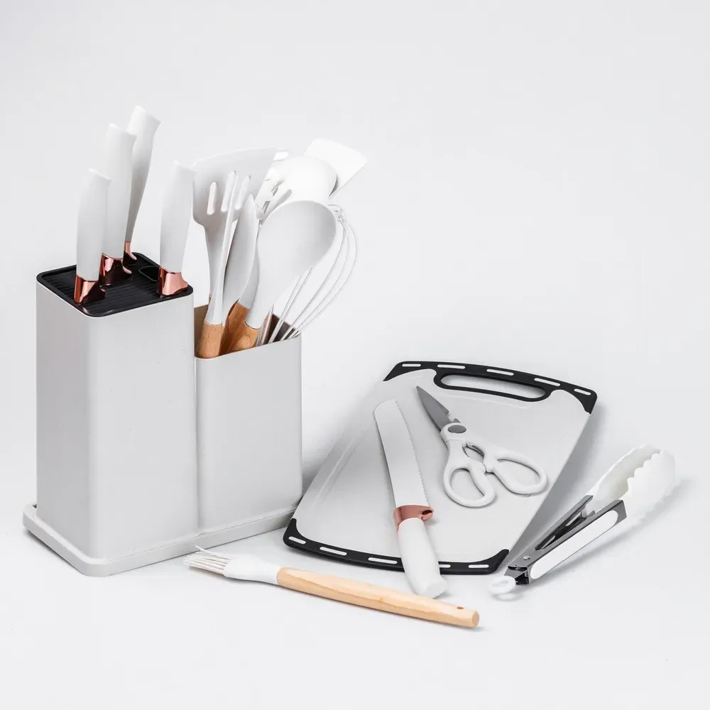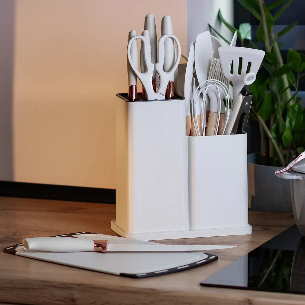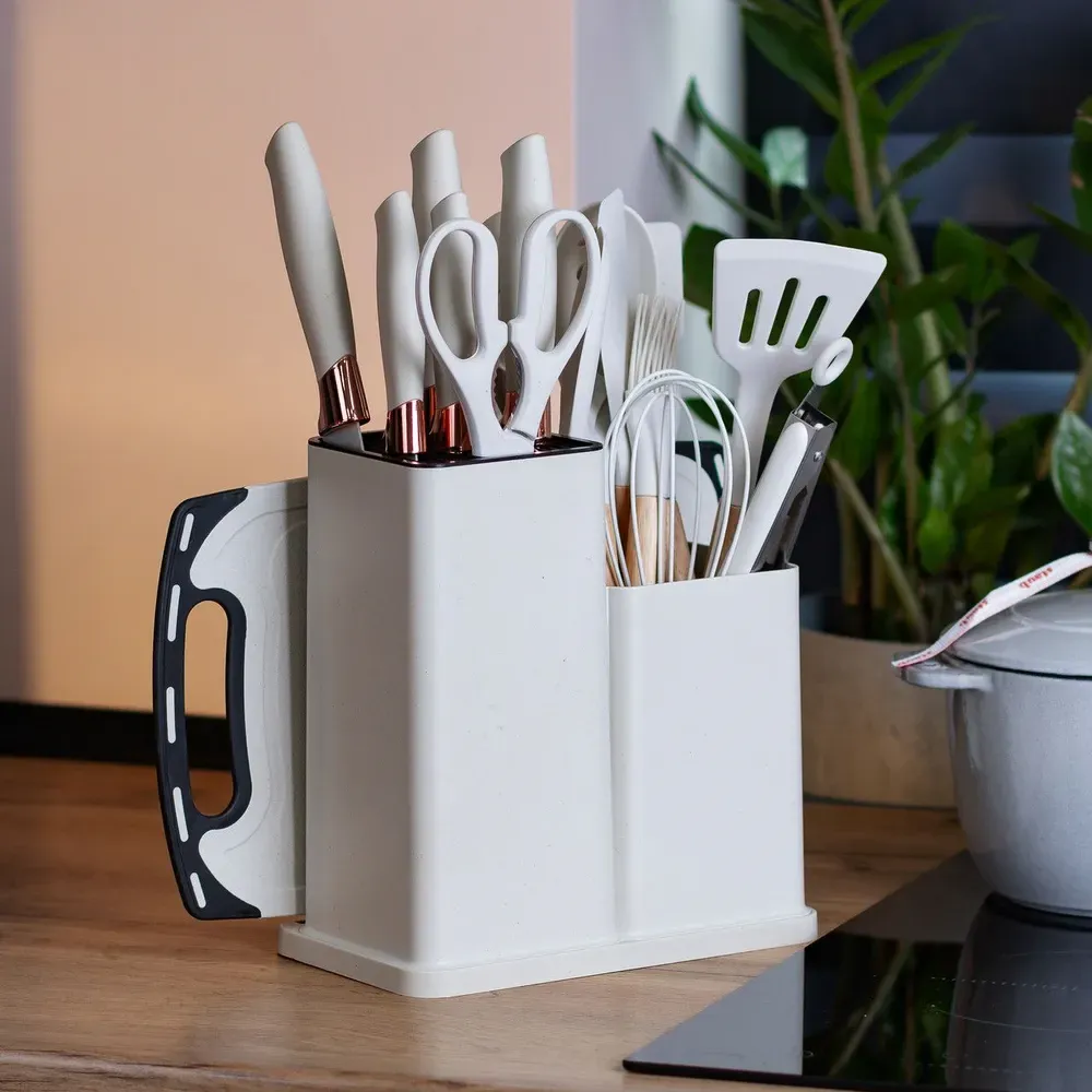 Комплект з 19 аксесуарів включає також набір кухонних ножів, обробну дошку і зручну підставку, завдяки чому може стати відмінним презентом кухарю-початківцю або професіоналу.