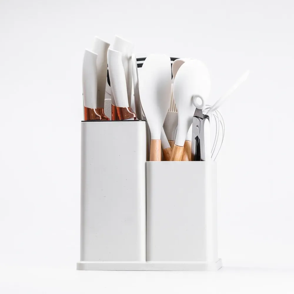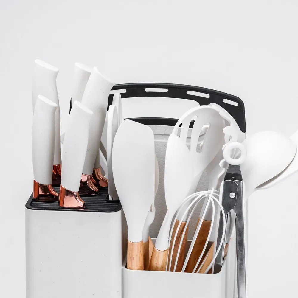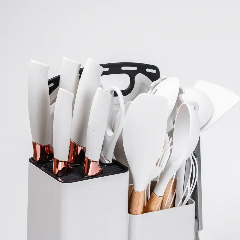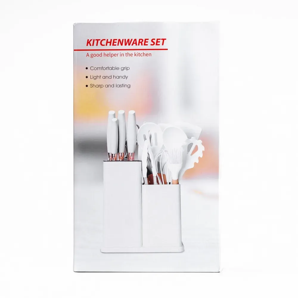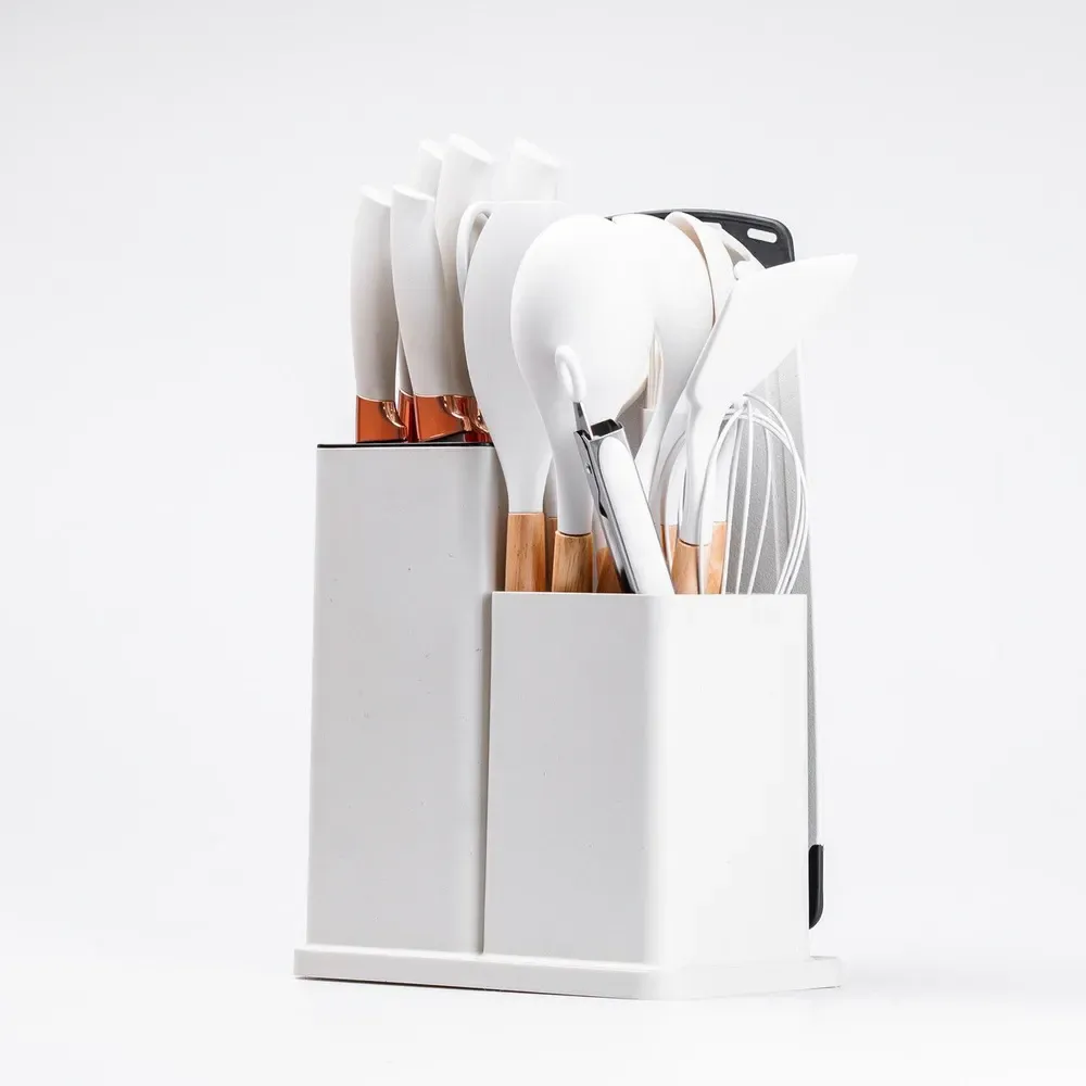 Комплект з 19 аксесуарів включає також набір кухонних ножів, обробну дошку і зручну підставку, завдяки чому може стати відмінним презентом кухарю-початківцю або професіоналу.