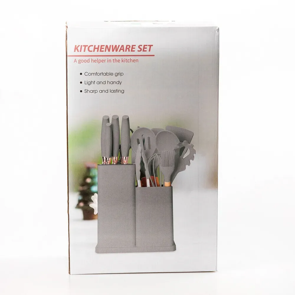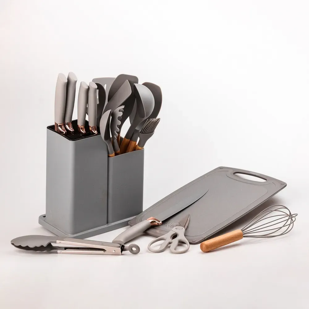 Комплект з 19 аксесуарів включає також набір кухонних ножів, обробну дошку і зручну підставку, завдяки чому може стати відмінним презентом кухарю-початківцю або професіоналу.