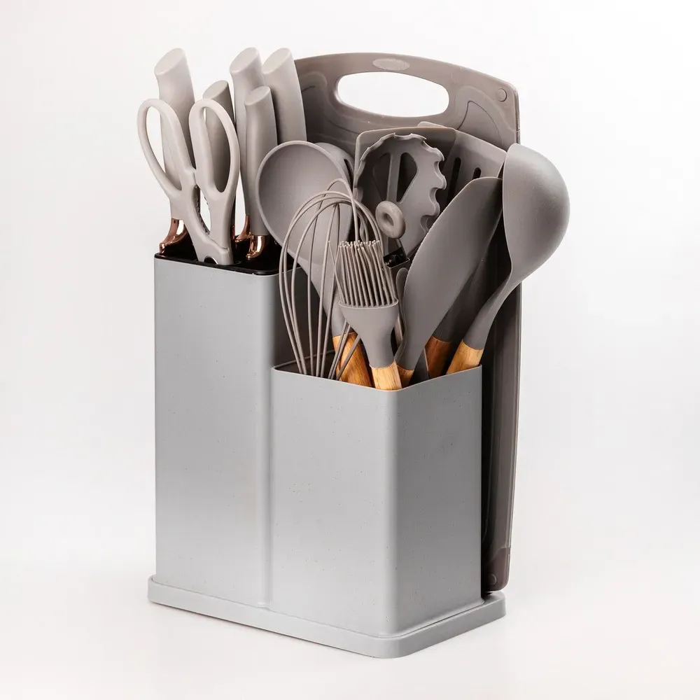 Набір кухонного приладдя на підставці 19 штук кухонні аксесуари з силікону з бамбуковою ручкою Сірий (HP6G)