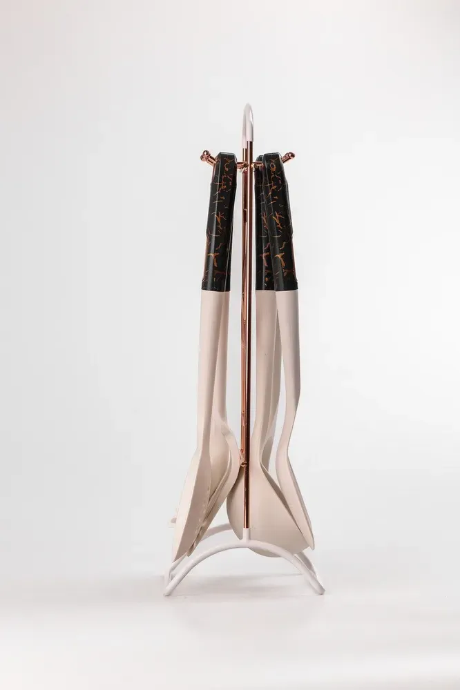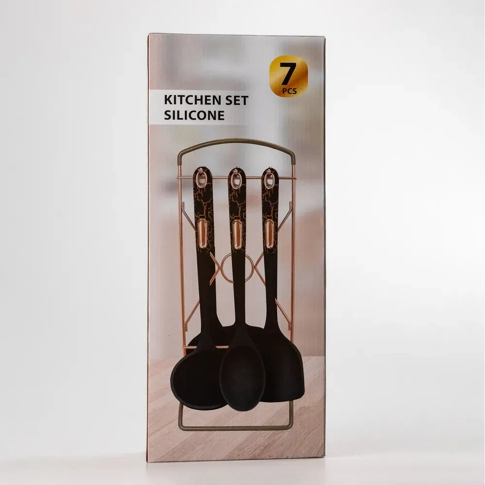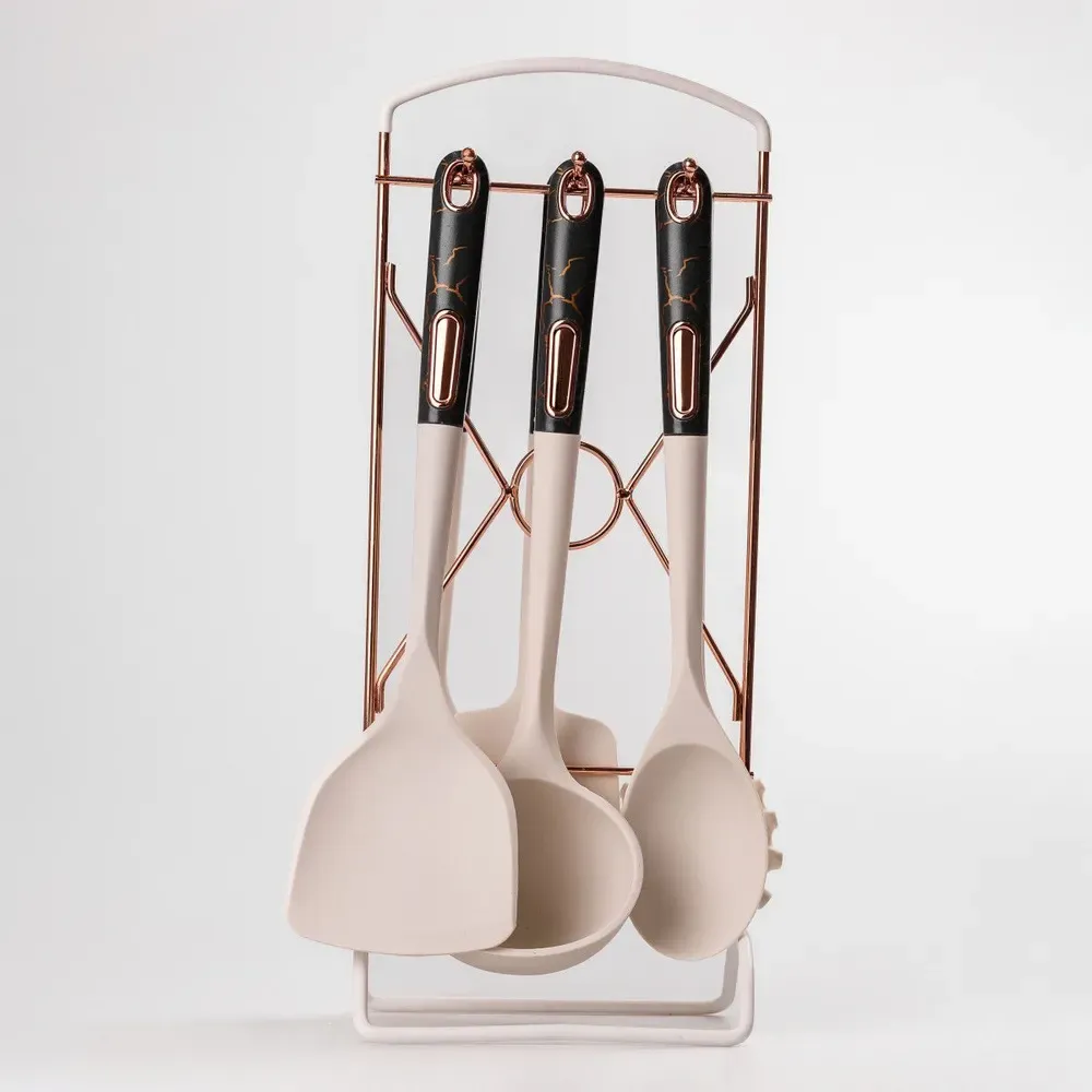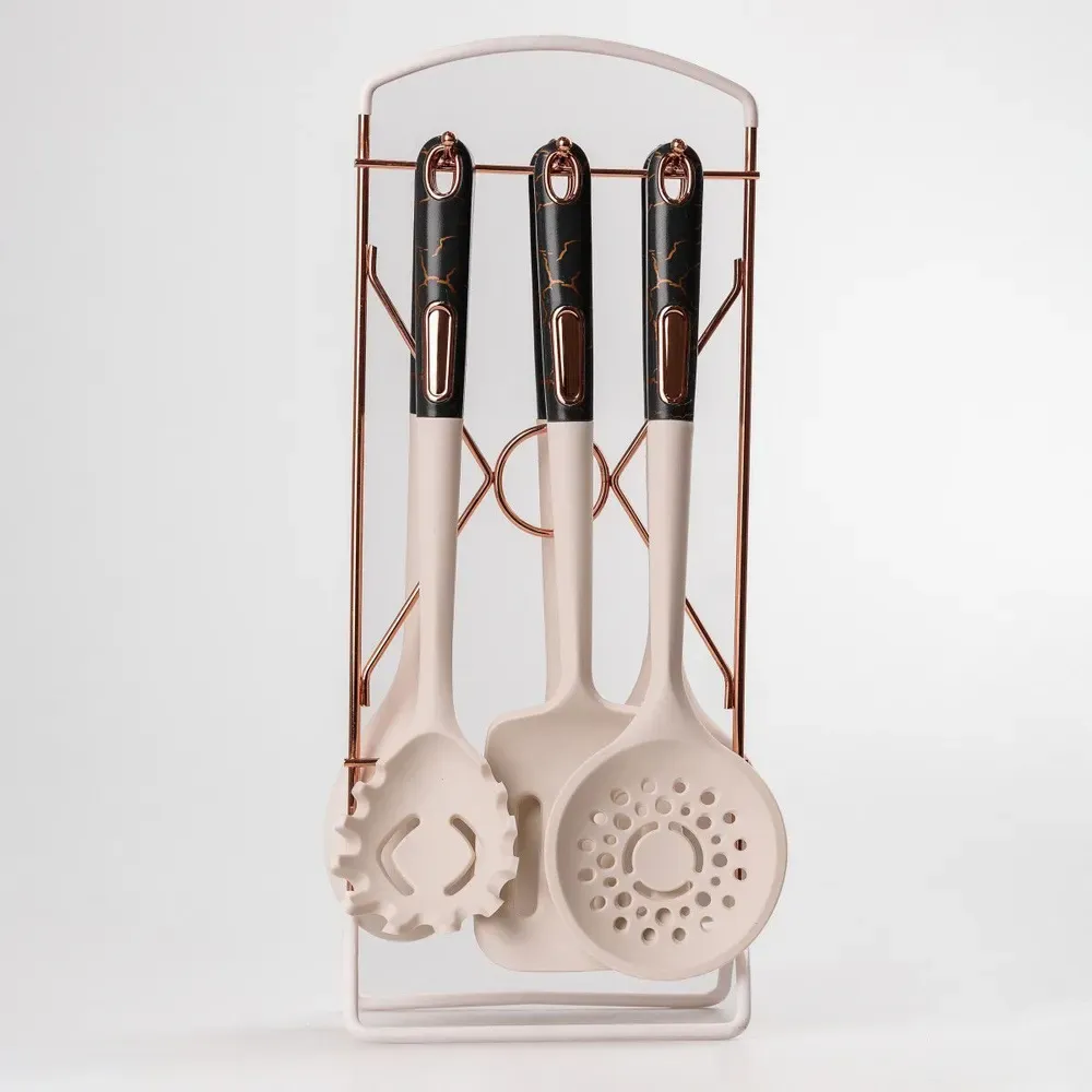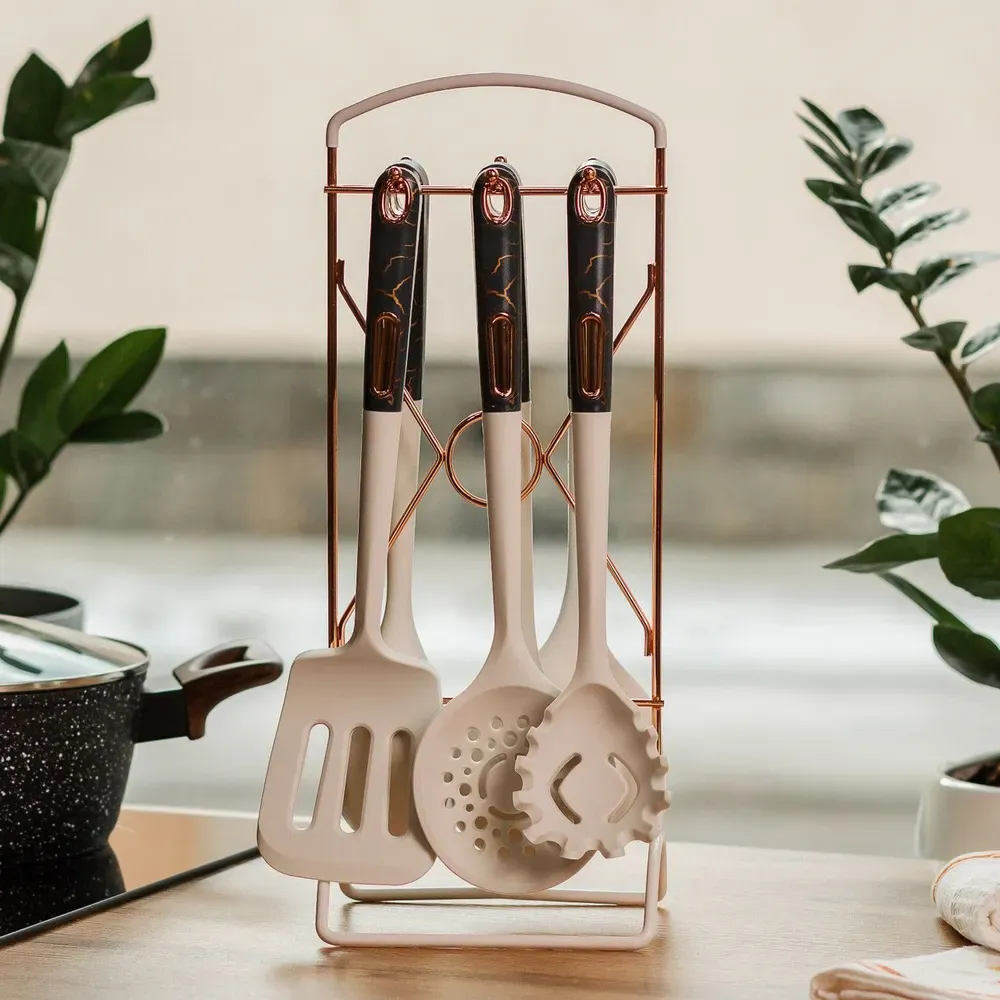 Набір кухонного приладдя на підставці містить 6 функціональних кухонних аксесуарів, призначених для різних завдань. До складу набору входять ложка, ополоник, ложка для спагеті, лопатка з прорізами, шумівка, лопатка.