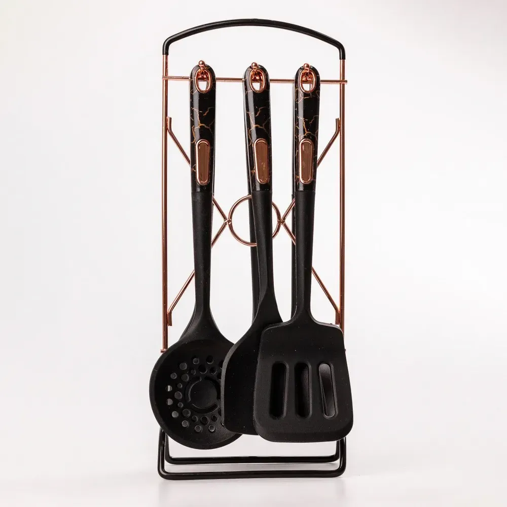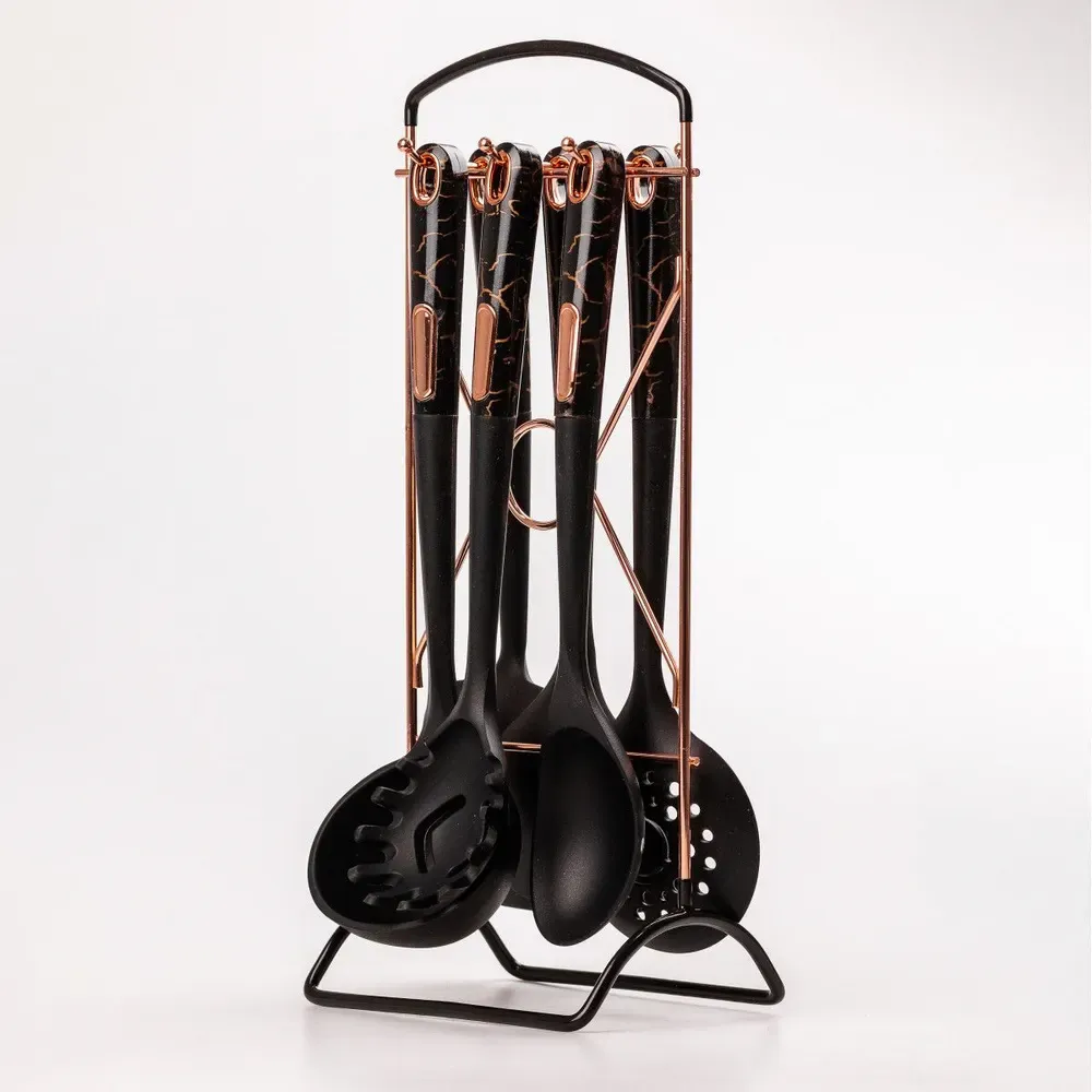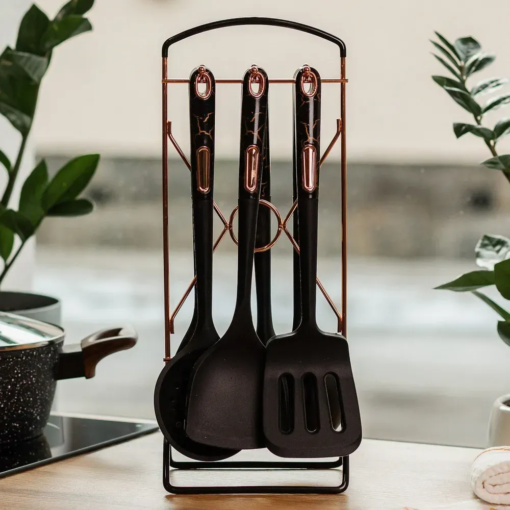 Набір кухонного приладдя на підставці містить 6 функціональних кухонних аксесуарів, призначених для різних завдань. До складу набору входять ложка, ополоник, ложка для спагеті, лопатка з прорізами, шумівка, лопатка.