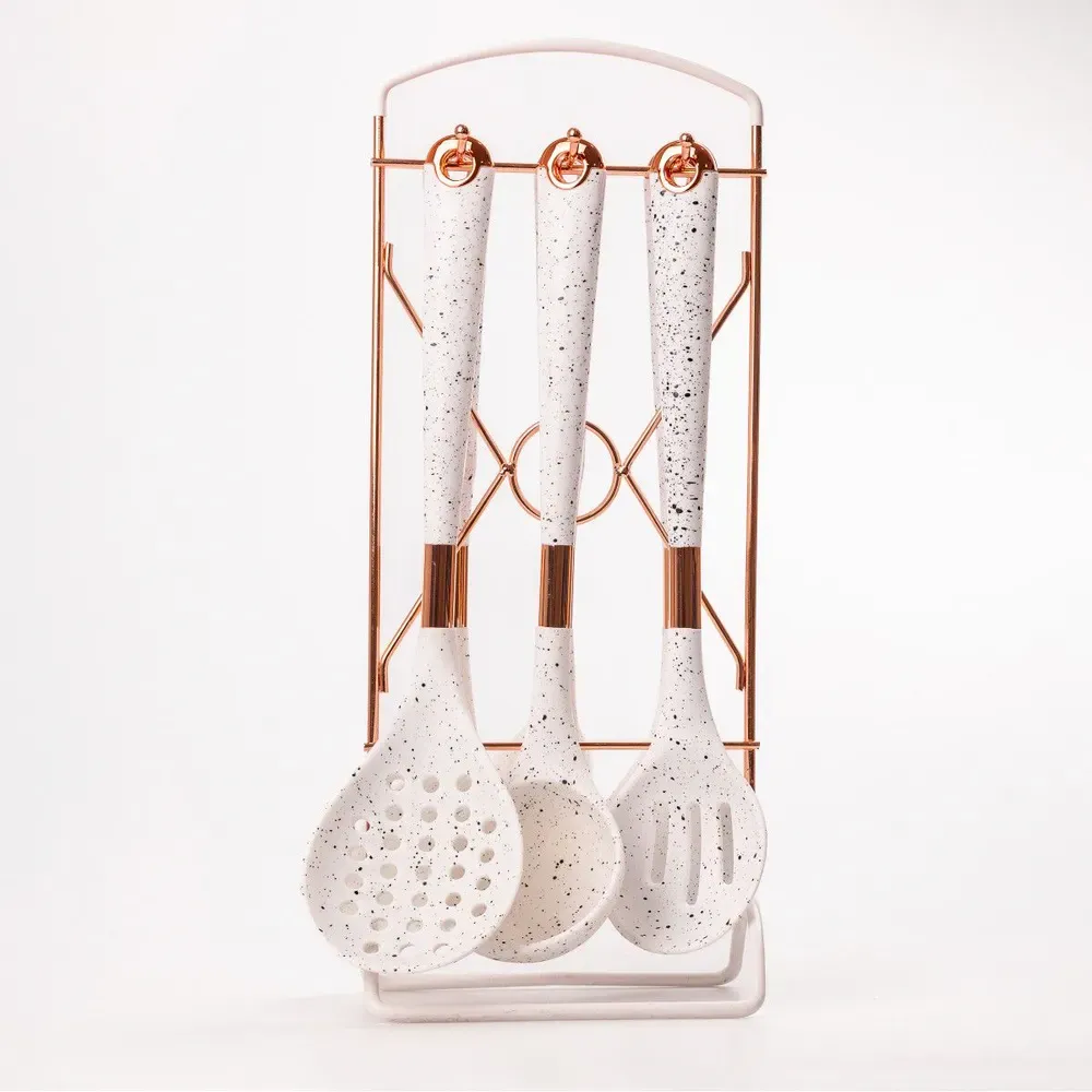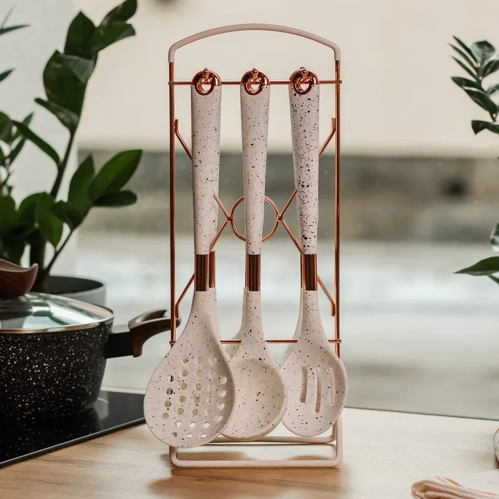 Набір кухонного приладдя на підставці включає 6 стильних кухонних аксесуарів. У наборі представлені ополоник, шумівка, ложка для салату, дві лопатки для смаження, пензлик. Крім того, в комплект входить зручна підставка для зберігання, що забезпечує порядок та легкий доступ до необхідних інструментів.