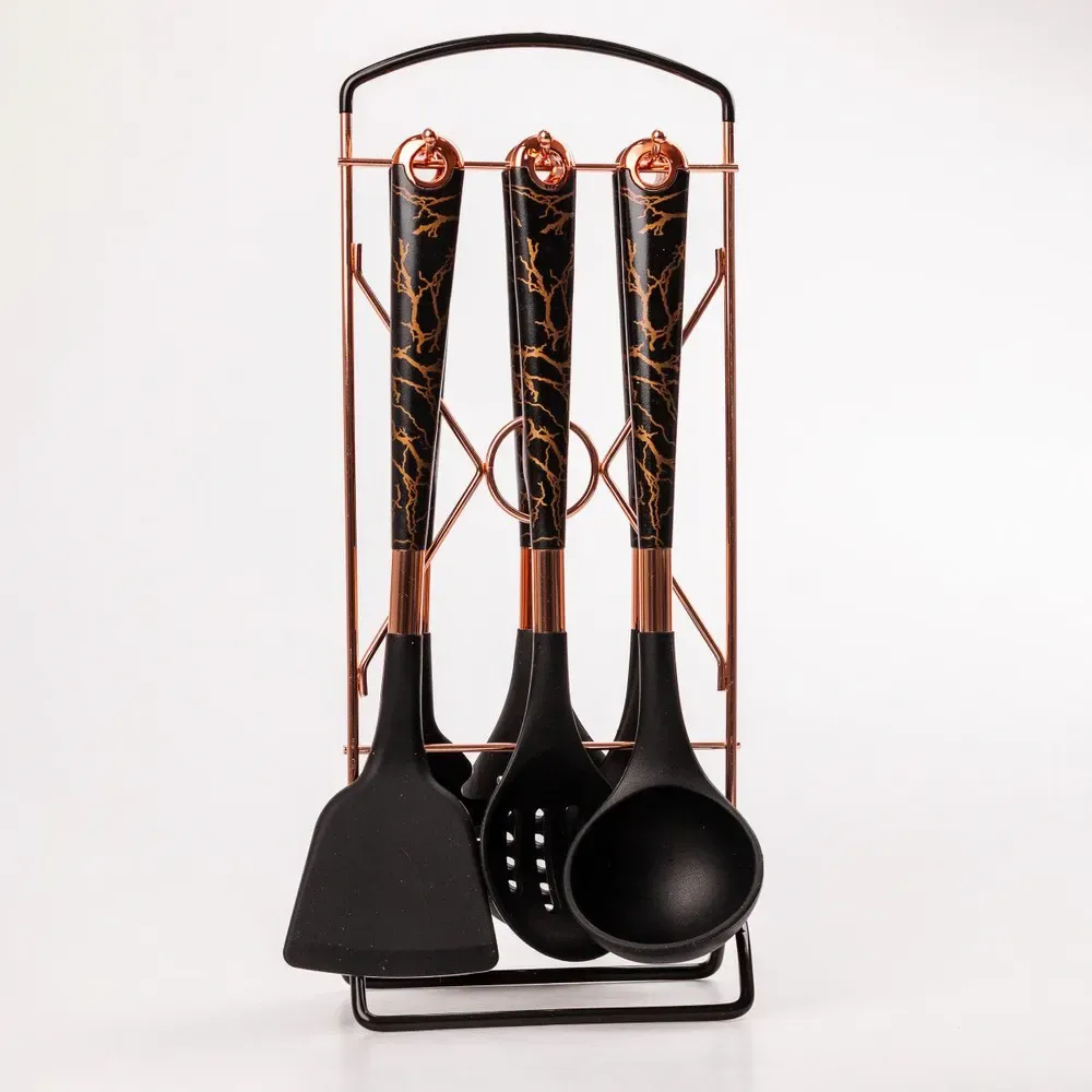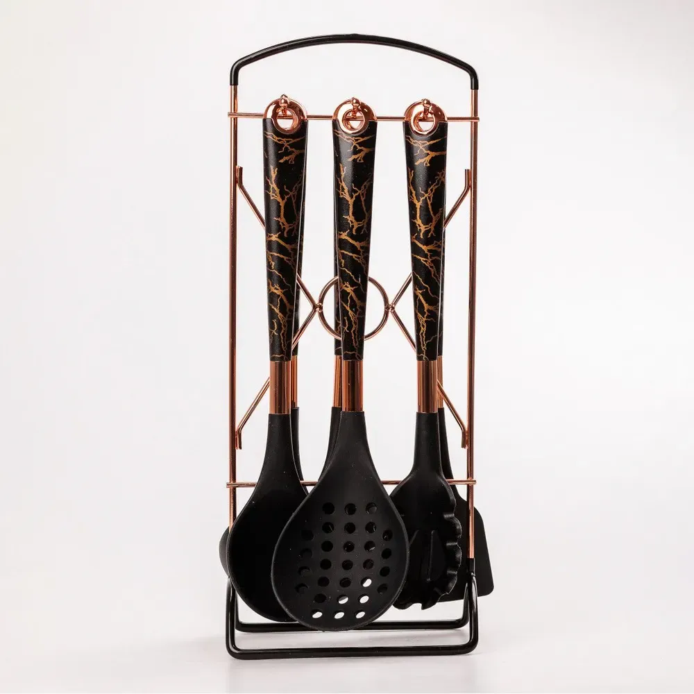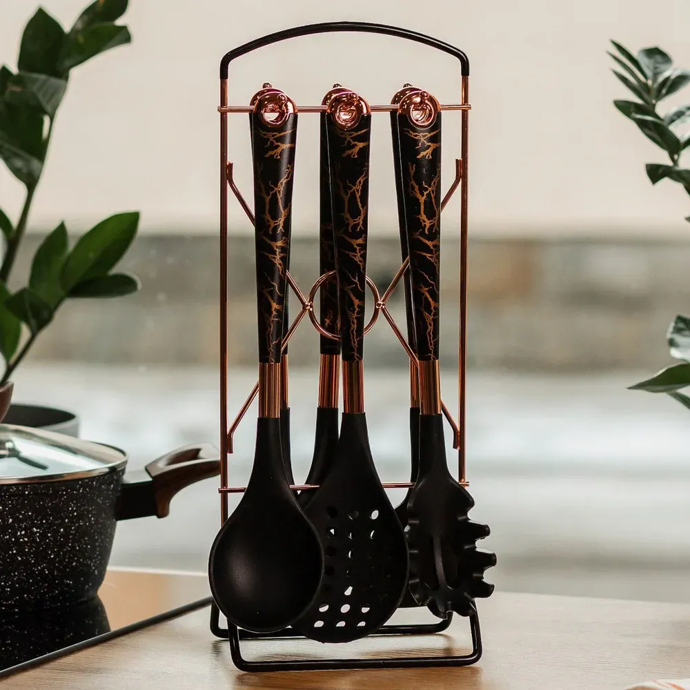 Набір кухонного приладдя на підставці включає 6 стильних кухонних аксесуарів у мармуровому дизайні. У наборі представлені ополоник, шумівка, ложка для салату, дві лопатки для смаження, пензлик. Крім того, в комплект входить зручна підставка для зберігання, що забезпечує порядок і легкий доступ до необхідних інструментів. Довжина приборів 32.5 см.
