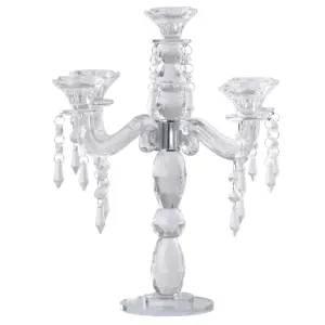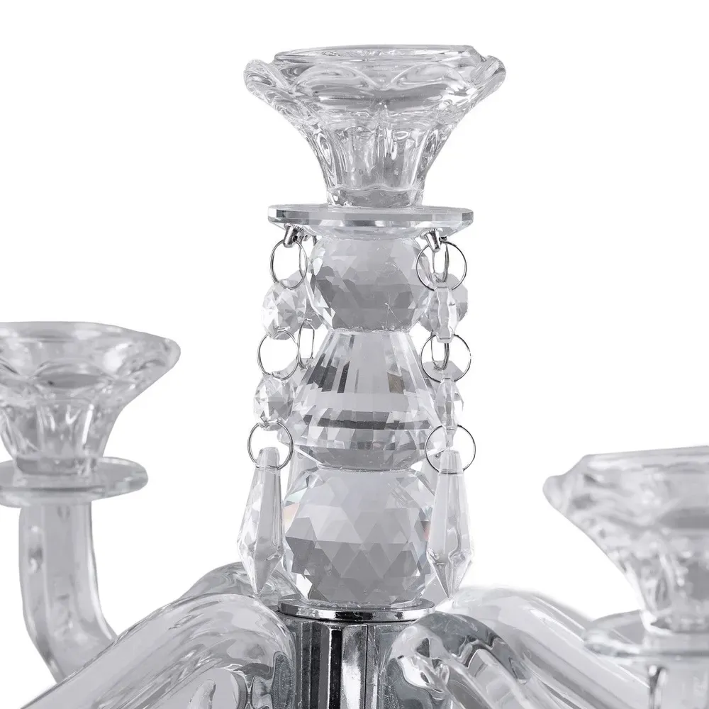 Скляний свічник на п'ять свічок - ідеальний варіант для святкового сервірування, створення романтичної атмосфери та просто як витончений та стильний елемент інтер'єру. Свічник доповнений витонченими скляними підвісками з кристалами різної форми, які надають йому особливого аристократичного вигляду.