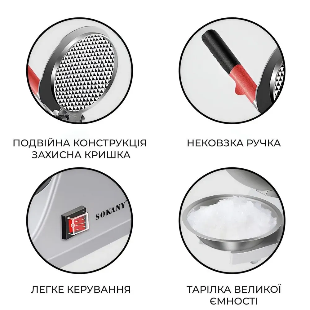 Sokany SK-777 - це надійний і функціональний подрібнювач для льоду, який додасть вашим напоям і десертам той самий холодок і текстуру, які ви шукаєте.