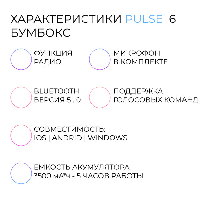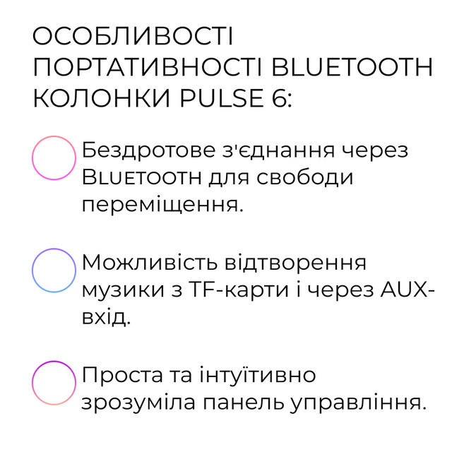 Забудьте про дроти та незручності! Бездротова колонка Pulse 6 з мікрофоном оснащена передовим Bluetooth-модулем 5.0, який забезпечує стабільне і безперебійне з'єднання з вашими пристроями. Ви зможете легко під'єднати колонку до свого смартфона, планшета або будь-якого іншого Bluetooth-сумісного пристрою і насолоджуватися музикою без зайвого клопоту. Крім того, Pulse 6 також підтримує відтворення музики з TF-карти і AUX-входу, що робить його універсальним і зручним у використанні.