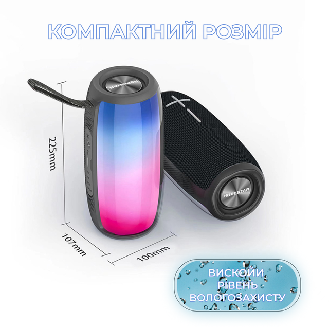 Бездротова колонка з підсвіткою виконана з АБС-пластику, завдяки чому захищена від бризок та підвищеної вологості, має невелику вагу, і не викликає жодних незручностей при транспортуванні.