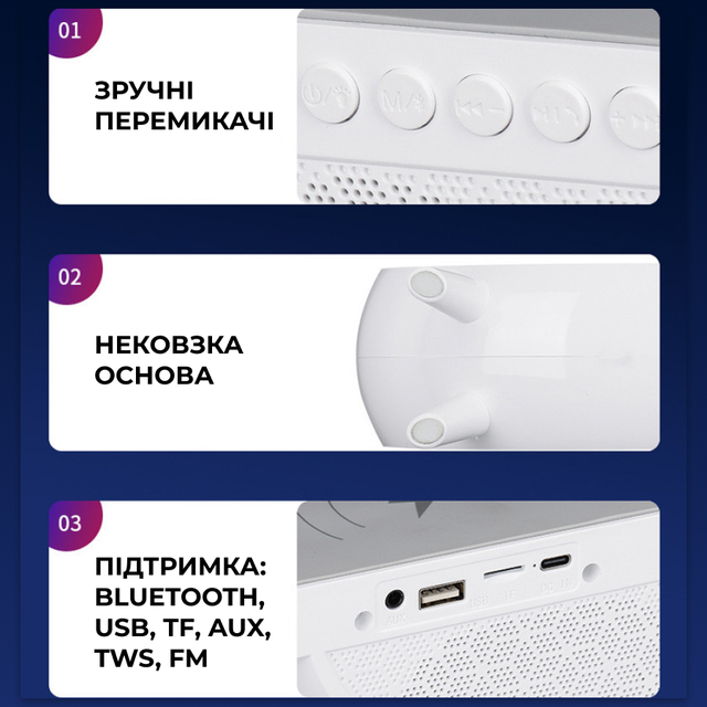 Особливості:Заряджання плеєра/смартфону|FM-приймач|Годинник будильник)