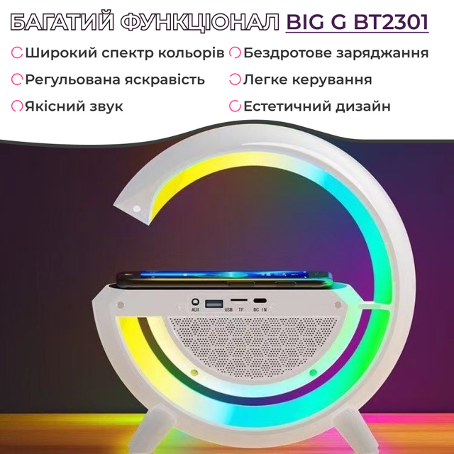 Портативна колонка з RGB-підсвіткою бездротова 20 Вт 3 в 1 зарядка та годинник в стилі Big G (BT2301W)