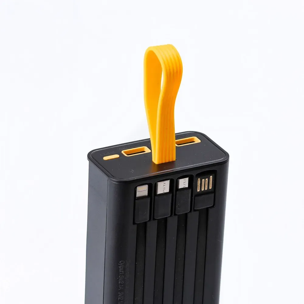 Має 4 вбудовані кабелі: USB-A, Micro-USB, Type-C та Lightning. Це дозволяє підключити практично будь-який пристрій без необхідності використання окремих кабелів, що зручно та економить місце.