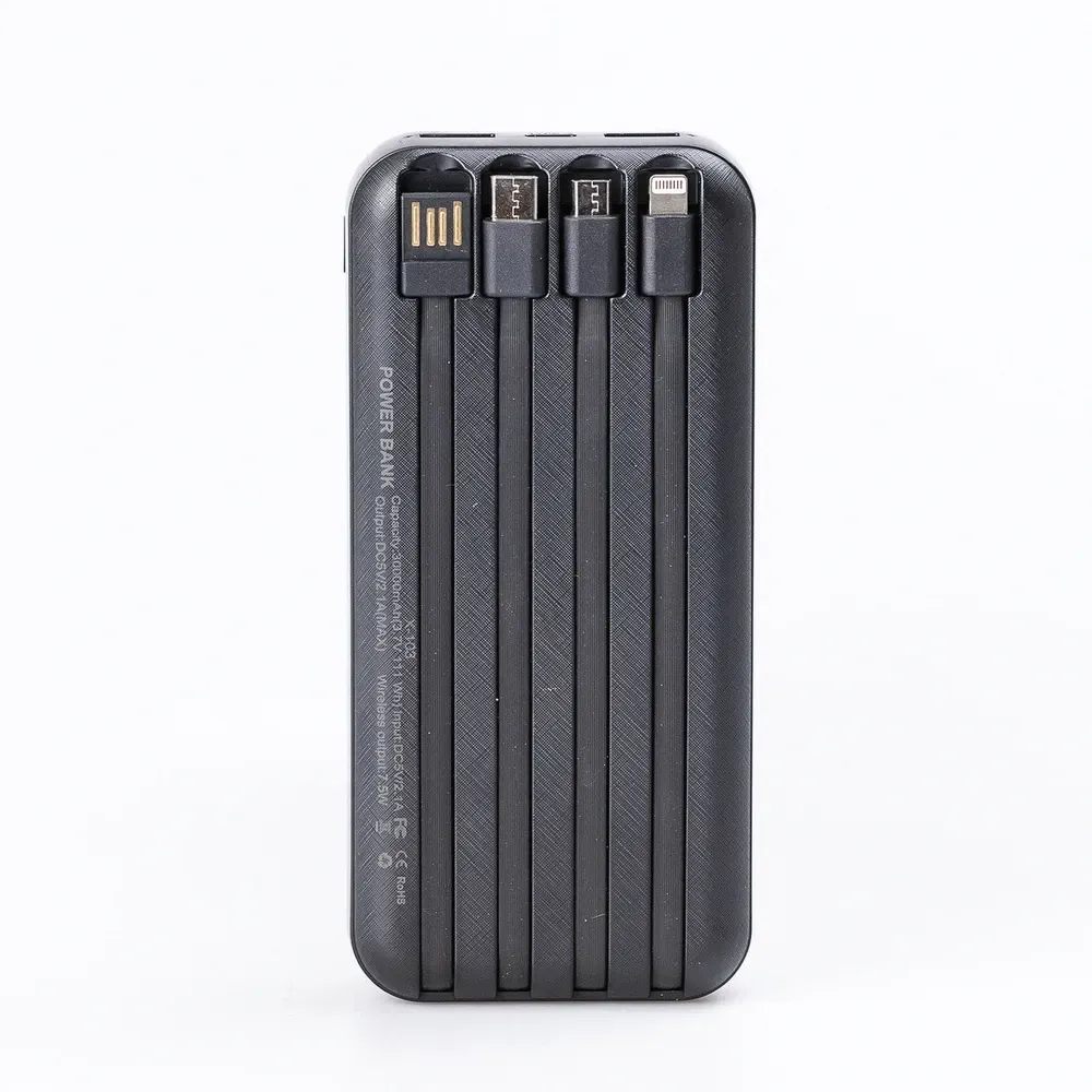 Повербанк має 4 вбудовані кабелі: два Micro USB, один Type-C і один USB. Це забезпечує універсальну сумісність із більшістю сучасних пристроїв та зручність у використанні без необхідності носити додаткові кабелі.