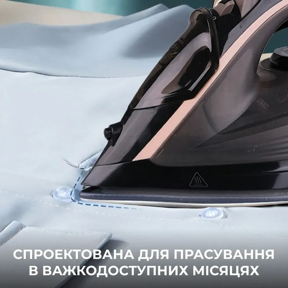 Потужна подача пари дозволить подужати найскладніші місця, розгладити сильно зім'яті та пересохлі речі. Дана функція дасть змогу впоратися зі шторами чи пальто, а також ідеально підходить для делікатних тканин. Система “Антикапля“ запобігає потраплянню води на одяг. А для того, щоб покращити якість прасування, праска оснащена функцією розбризкування води.