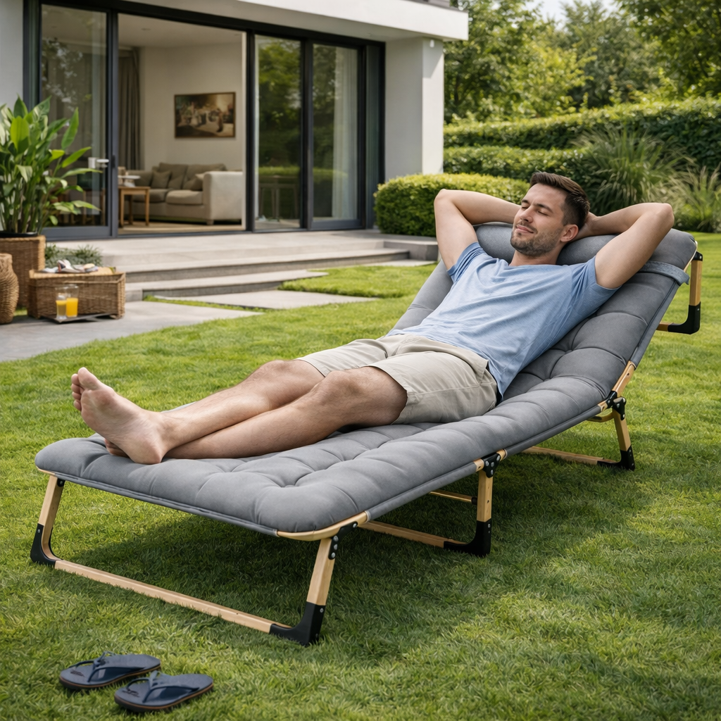 Наш складний туристичний лежак забезпечить вам зручний відпочинок у саду, на дачі, під час кемпінгу або поїздок на природу чи до водойми.
