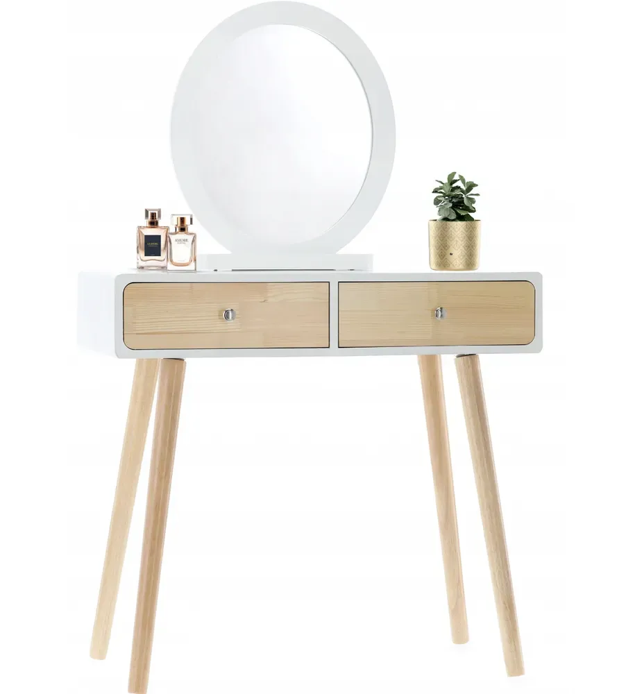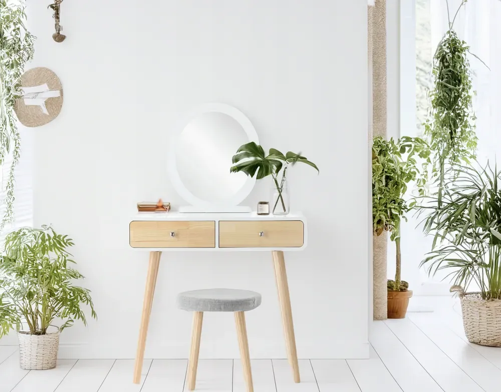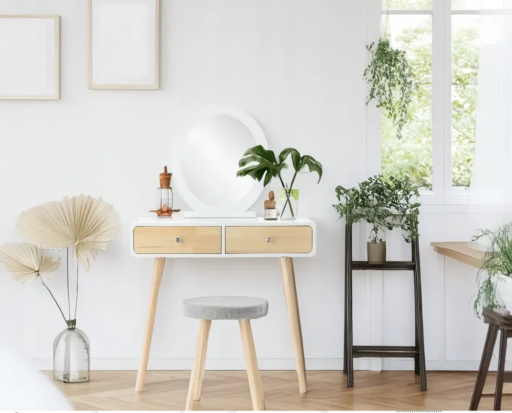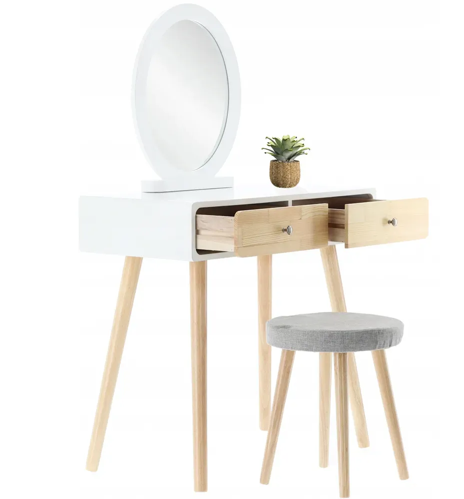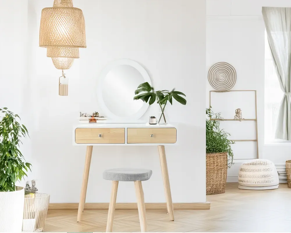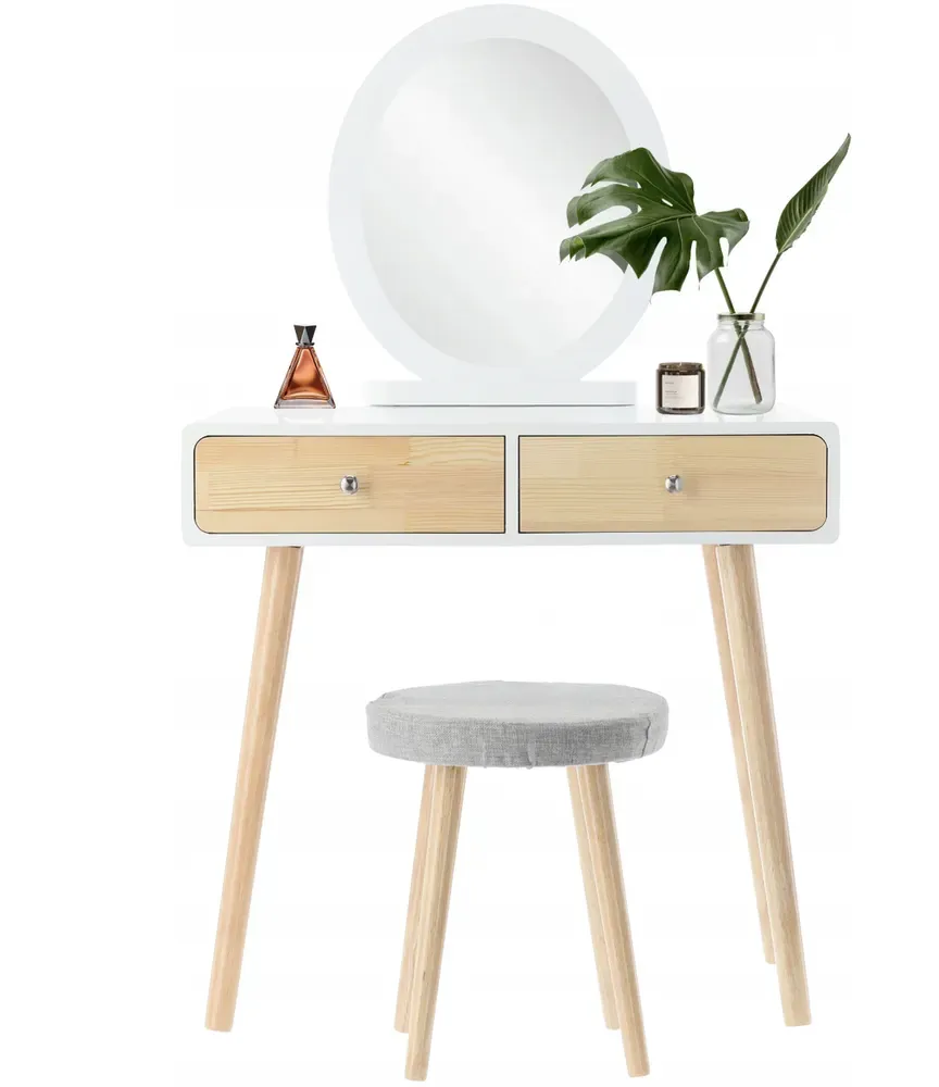 Туалетний столик оснащений великим практичним дзеркалом, яке ідеально підходить для ваших щоденних ритуалів догляду за собою. Дві місткі шухляди дозволяють зберігати різноманітні косметичні засоби та аксесуари, підтримуючи порядок навколо себе. Завдяки ергономічному розташуванню, він вмістить все необхідне для комплексного догляду за красою.