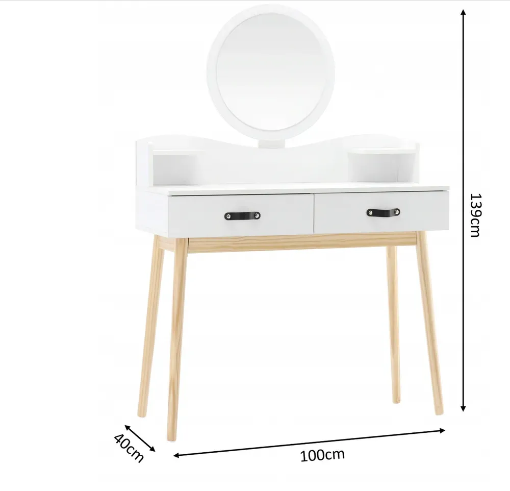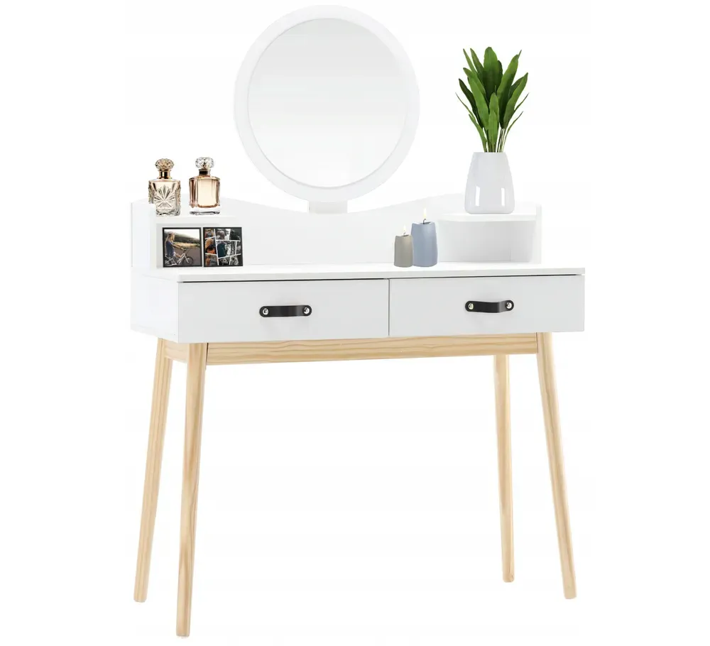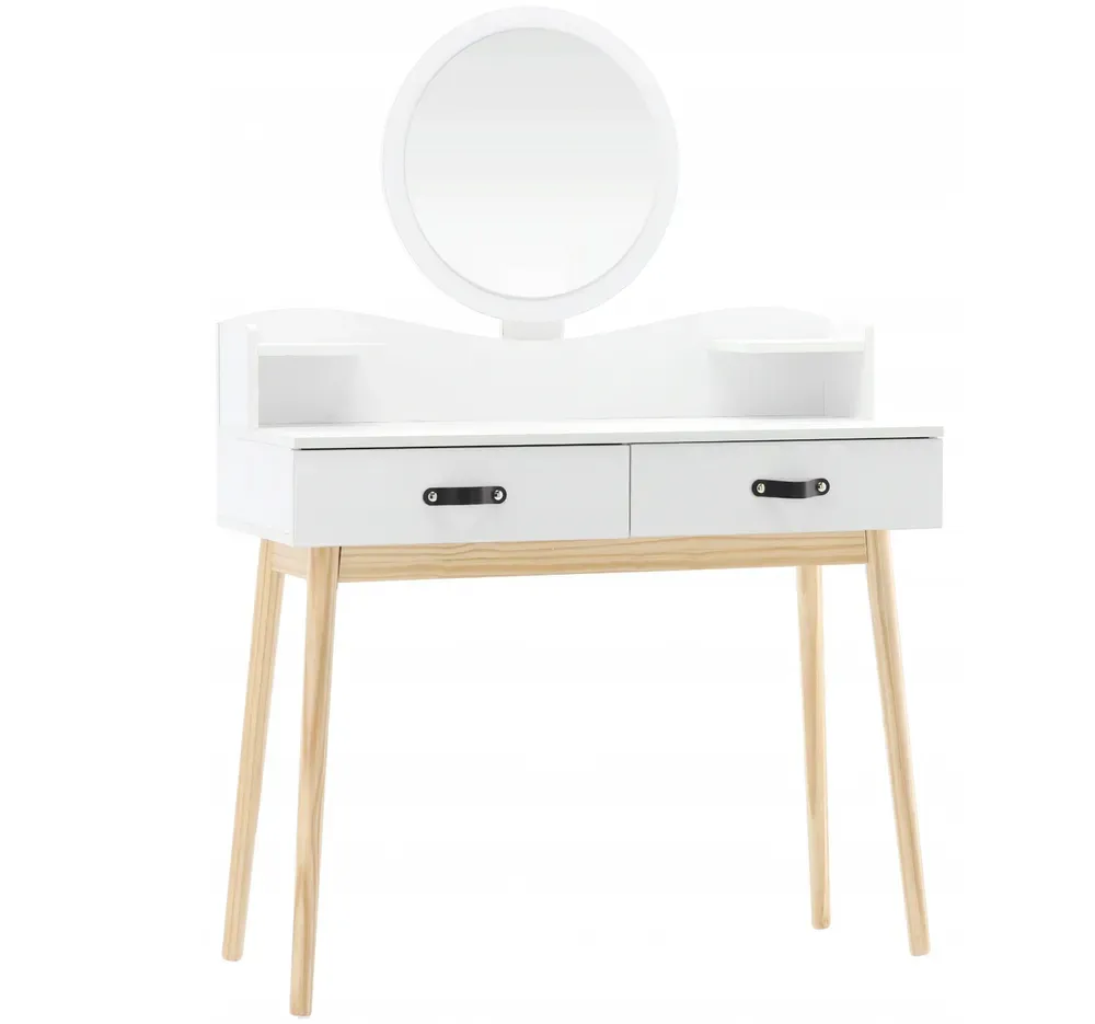 Центральним елементом туалетного столика є кругле дзеркало, яке додає йому шарму та функціональності. Воно дозволяє контролювати свій зовнішній вигляд з усіх боків, полегшуючи щоденний догляд за собою та підготовку до дня.