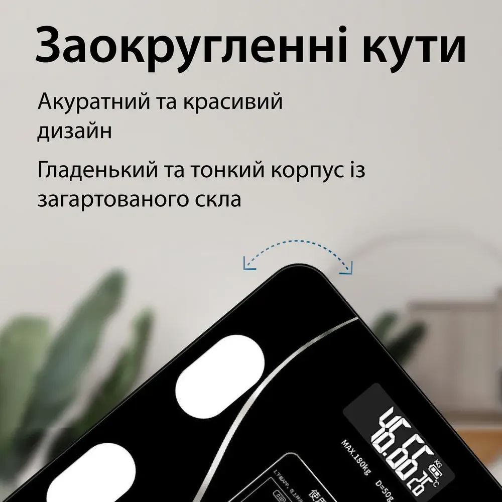 Поверхня ваг виготовлена з міцного і гладкого загартованого скла і витримує вагу до 180 кг. Ніжки мають спеціальні протиковзкі насадки, що забезпечує комфортне та безпечне використання ваг.