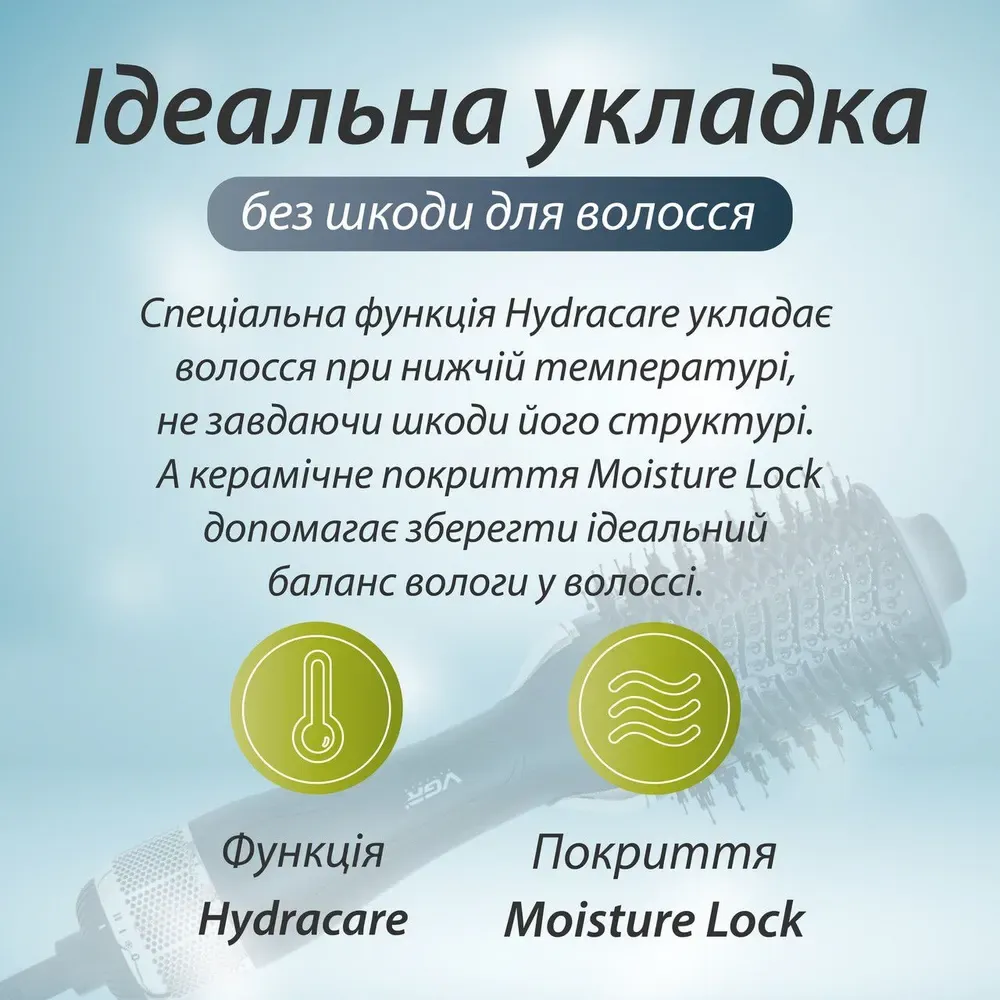 Спеціальне налаштування температури Hydracare дозволяє сушити та укладати волосся при нижчій температурі, а основа з керамічним покриттям Moisture Lock допомагає зберегти ідеальний баланс вологи у волоссі. Таке покриття ефективніше переносить мікрочастинки, що кондиціонують, з кожним рухом приладу по волоссю.