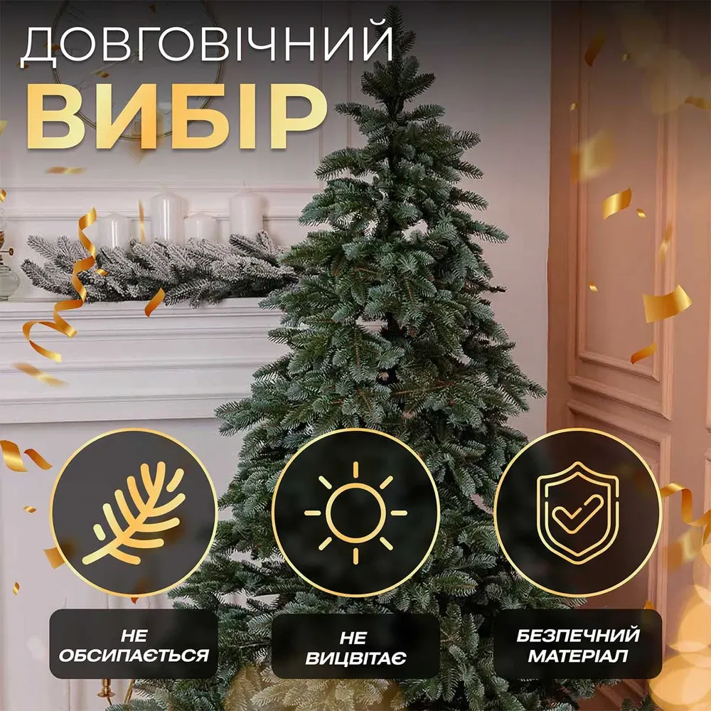 Штучна ялинка на відміну живого дерева не залишає сміття, не викликає алергічну реакцію і може використовуватися багато років. Висота ялинки досягає 1.8 метрів, що робить її ідеальною для розміщення у житлових кімнатах. Пишні густі гілки виконані з якісних, довговічних матеріалів, які надають дереву натурального вигляду. Міцний каркас та стійка підставка забезпечують надійне встановлення ялинки. Основні характеристики ялинки висота 1,8 метра; ширина 1,16 метр; матеріал ялинки – ПЕ; діаметр гілок – 4.5 см; кількість гілочок 359 шт; підставка – дерев'яна, в комплекті. Штучна ялинка стане головною окрасою в офісі, у дитячих садках, школах, у будинку чи квартирі. Приємний натуральний колір, пухнаста пружна хвоя і густа крона надають цій ялині особливої чарівності. Ялинка обов'язково подарує вам зимове свято, новорічний настрій та створить атмосферу затишку. Переваги купівлі штучної ялинки багаторазове використання; штучна ялина не обсипається; легка установка та зберігання; турбота про довкілля. Купуючи штучну ялинку, Ви зберігаєте життя натуральним деревам. Купити штучну ялинку 1.8 метрів можна з доставкою по всій Україні.