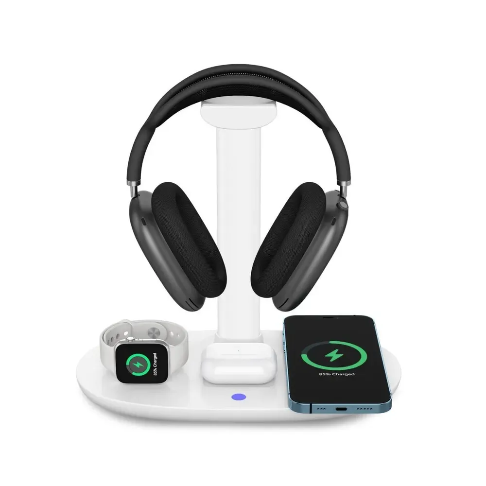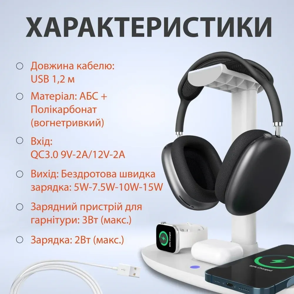 Підставка для навушників 4 в 1, тримач для гарнітури + бездротовий зарядний пристрій - це стильне і практичне рішення для організації вашого робочого простору та ефективної зарядки ваших пристроїв.