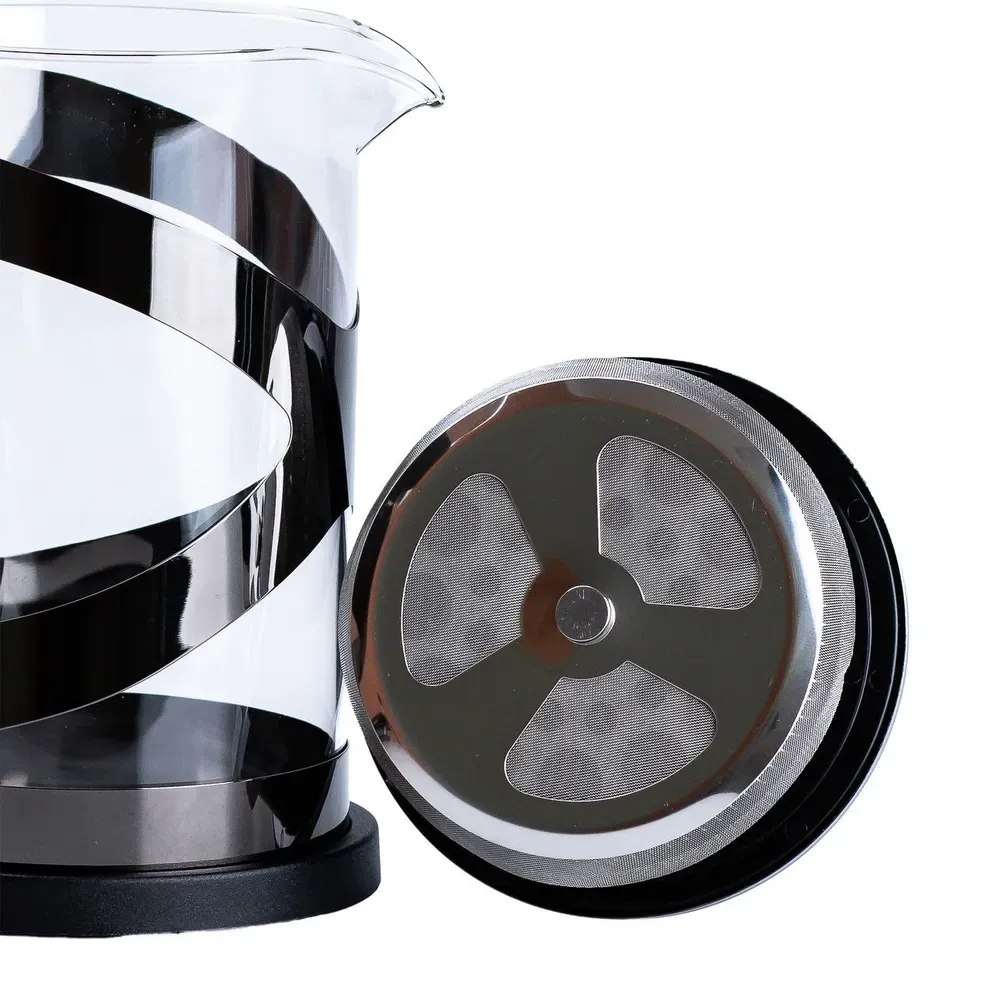 Цей скляний френч-прес - ідеальне поєднання функціональності та стилю для поціновувачів ароматної кави та чаю. Його елегантний дизайн та прозорі стінки дозволяють насолоджуватися красою та процесом заварювання напою. Спеціально розроблений фільтр усередині френч-пресу забезпечує ідеальне пропускання води через кавові гранули або чайне листя, що створює насичений та ароматний напій. Додатково він легко знімається для зручного очищення. Зручна ручка забезпечує комфортне захоплення та безпечне виливання гарячого напою.