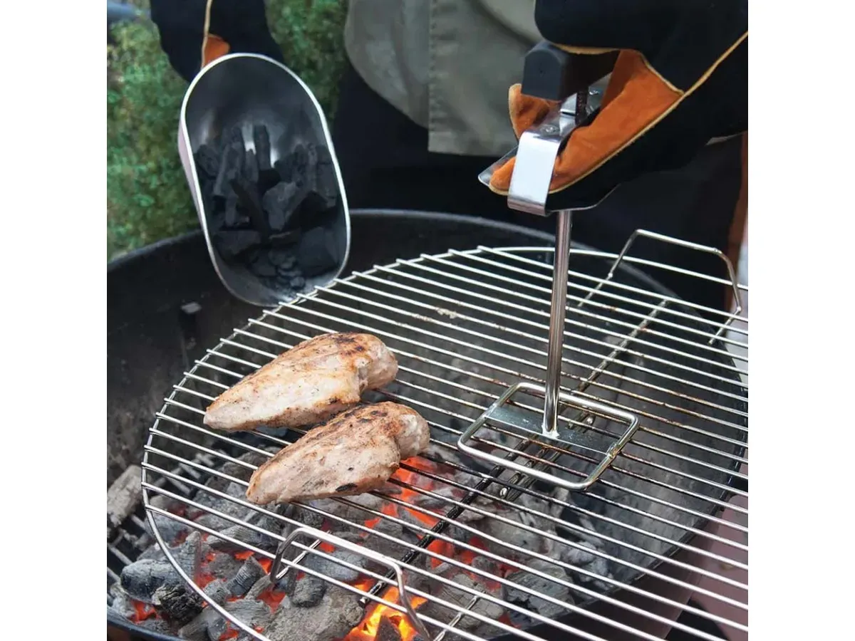 Знімач решітки Grilli 777475 призначений для зручної та безпечної фіксації і підйому чавунних і сталевих решіток гриля. З цим інструментом процес зняття решітки стає максимально простим і комфортним. Досить встановити знімач на решітку, стиснути ручку і повернути його на ¼ обороту (90°). Після цього відпустіть ручку, переконайтеся в надійній фіксації і акуратно підніміть решітку. Знімач дозволяє швидко зняти решітку для додавання вугілля, тріски або установки додаткових аксесуарів. Потужний пружинний механізм дає можливість працювати однією рукою, залишаючи другу вільною. Основні технічні переваги: • Надійний пружинний механізм фіксації.• Теплозахисний екран для безпеки рук.• Міцна конструкція з нержавіючої сталі.• Зручна ергономічна ручка. Основні технічні характеристики: • Матеріал: нержавіюча сталь, дерево.• Розміри: 34 x 10 x 10 см.