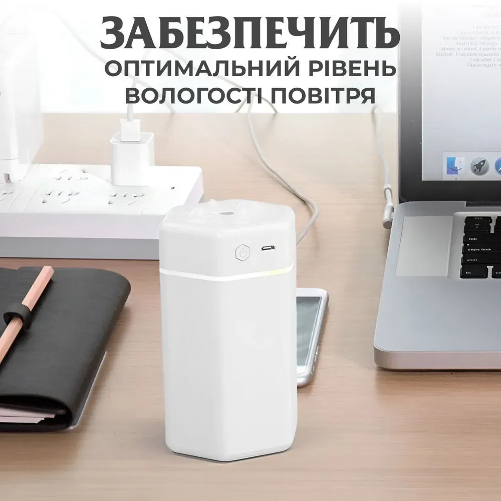Цей маленький зволожувач не тільки забезпечує ваш простір зволоженим повітрям, а й слугує джерелом світла, створюючи спокійну обстановку для гарного нічного сну. Можливість видимого ультразвукового прохолодного туману робить його ідеальним для використання в будь-якому місці, де вам потрібна додаткова вологість і затишок.