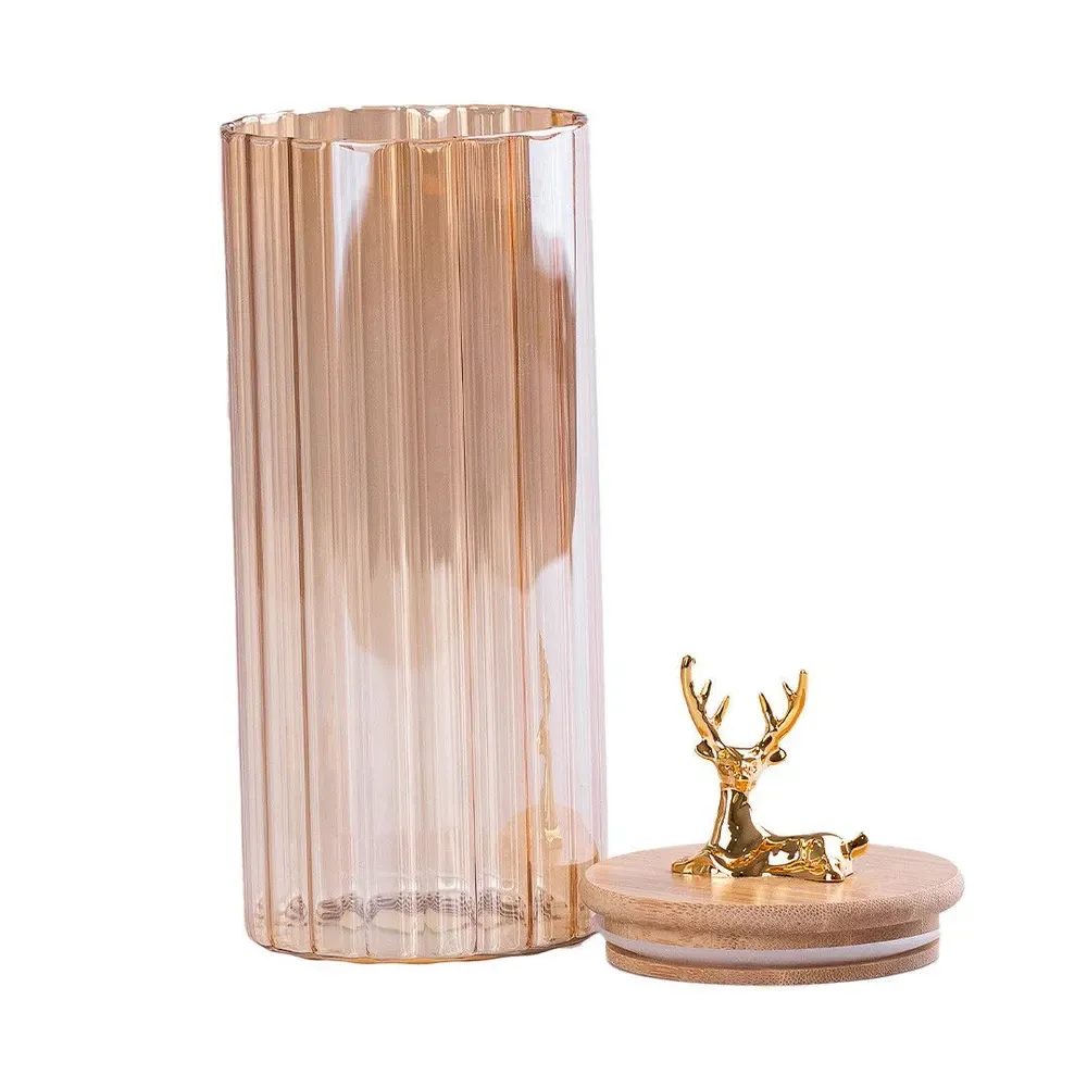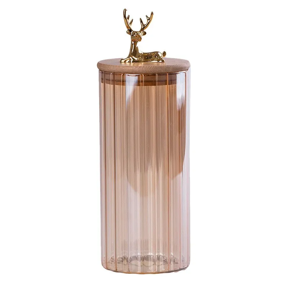 Банка для сыпучих продуктов с бамбуковой крышкой и стеклянным корпусом – это эстетическое и практичное решение для вашей кухни. Стекло обеспечивает свежесть продуктов, в то время как бамбуковая крышка с изящной фигуркой оленя, которая служит ручкой, придает не только удобство открытия, но и придает изысканный декоративный акцент. Эта емкость является практичным и стильным способом организации пространства. а фигурка оленя придает ей уникальный и приятный художественный штрих.