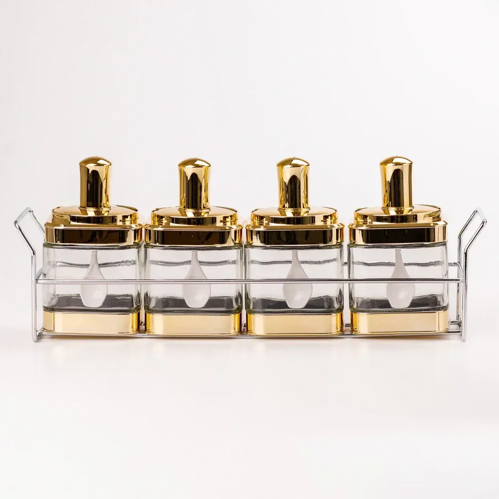 Банки для сыпучих продуктов набор из 4 шт. стеклянные емкости с ложкой на металлической подставке. (HP531FS1031J)