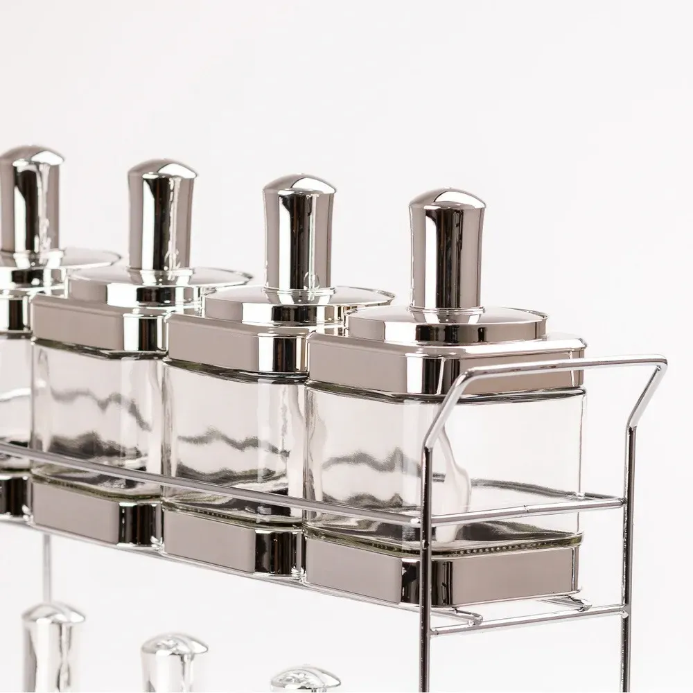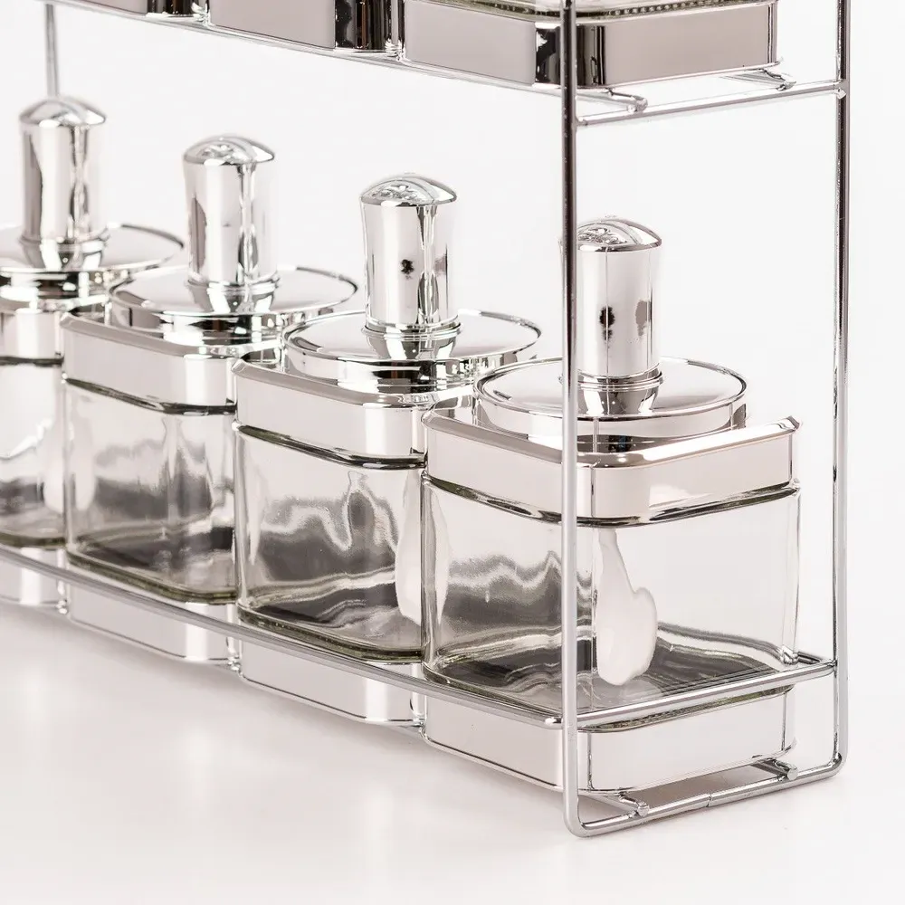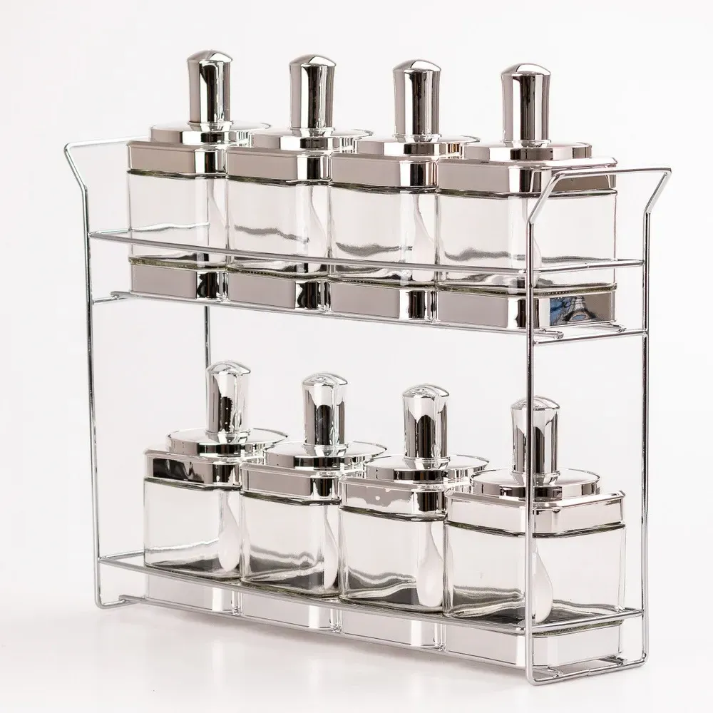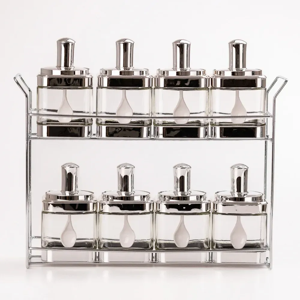Банки для сыпучих продуктов в наборе из 8 штук – стеклянные емкости для удобного хранения с ложками, представленные на двухъярусной металлической подставке. Каждый ярус подставки вмещает по 3 банка, обеспечивая компактное и аккуратное размещение.