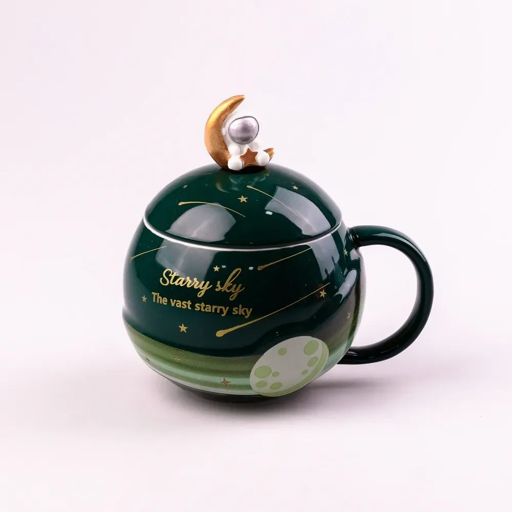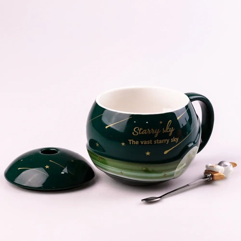 Чашка керамическая 400 мл Космонавт с крышкой и ложкой 400 мл Зеленый (HP877GR)