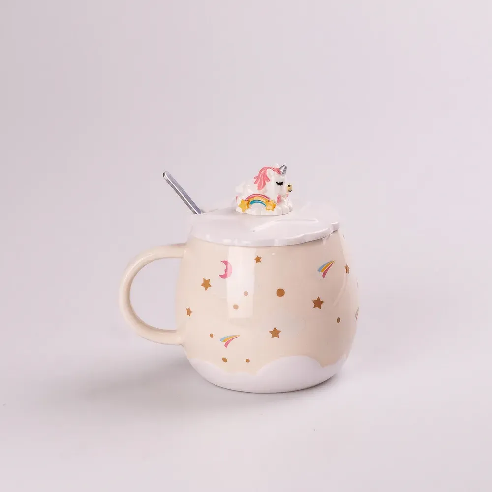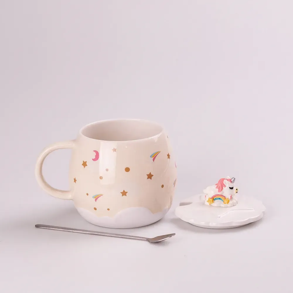 Оригинальная чашка с милым декоративным оформлением отлично подходит и для домашнего использования, и в качестве презента на любое праздник. Чашка имеет индивидуальный рисунок, на крышечке расположена объемная фигурка единорога, которая одновременно служит ненагревающейся ручкой. Такая кружка приведет в восторг любую представительницу прекрасного пола и станет неотъемлемой частью повседневной жизни. Чашка изготовлена из термостойкой керамики, имеет достаточно большой объем, в комплекте поставляется чайная ложечка.