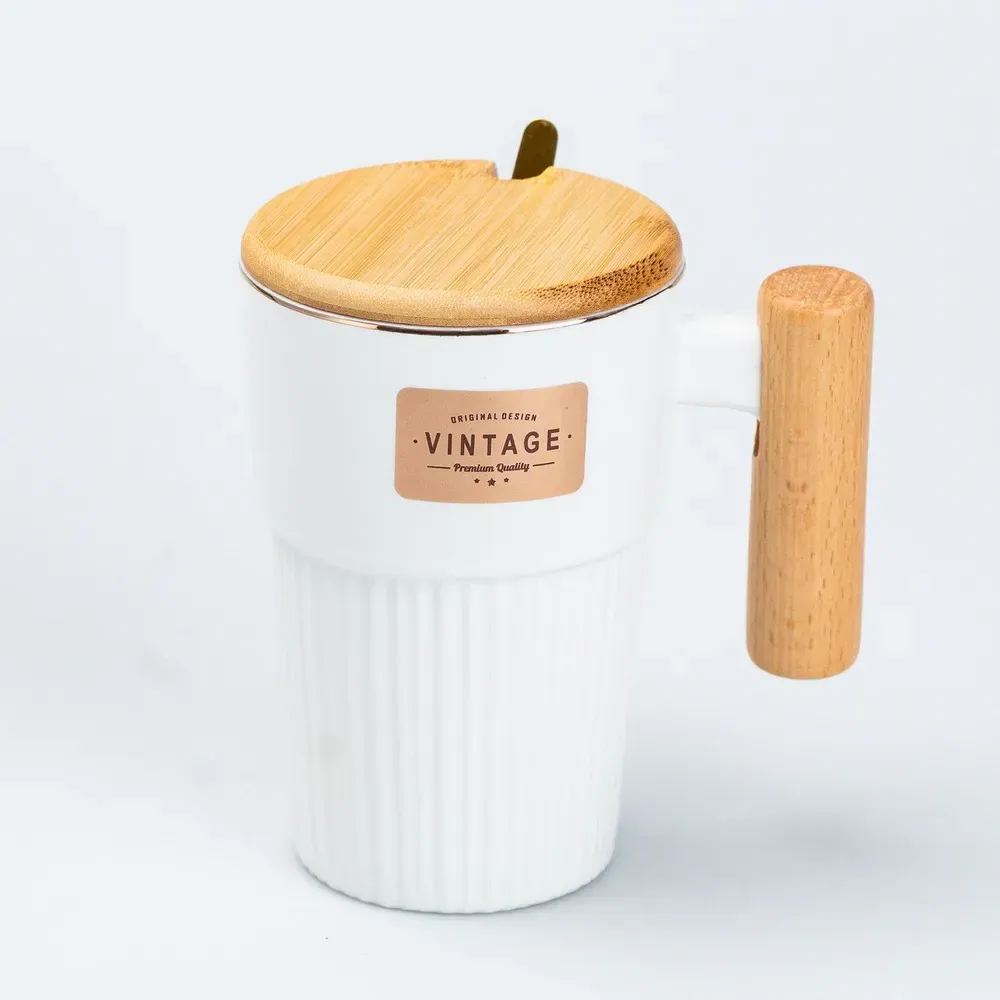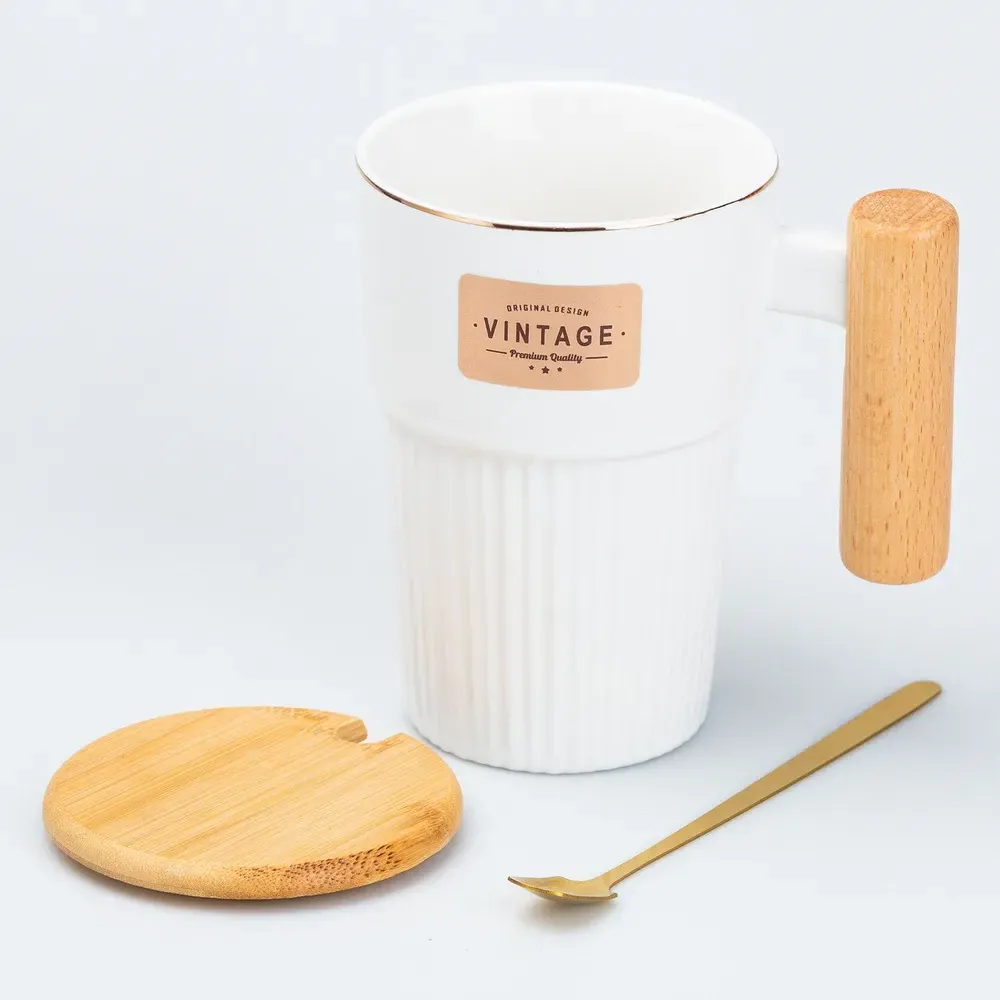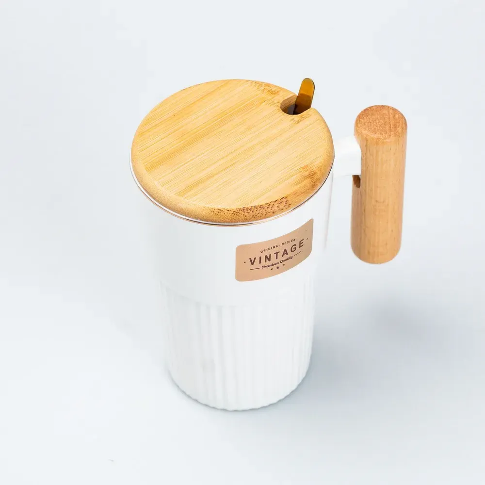 Чашка керамическая с ложкой и бамбуковой крышкой 400 мл Белая (HP7205W)