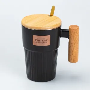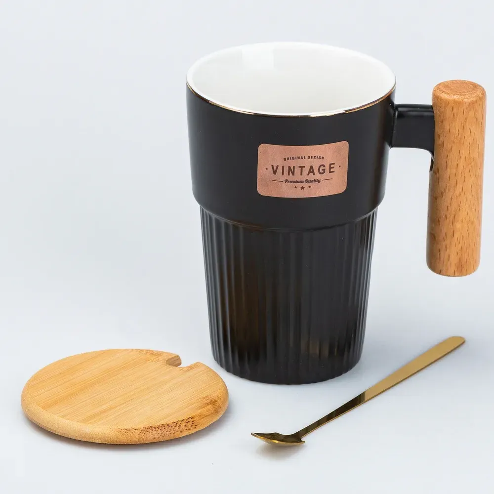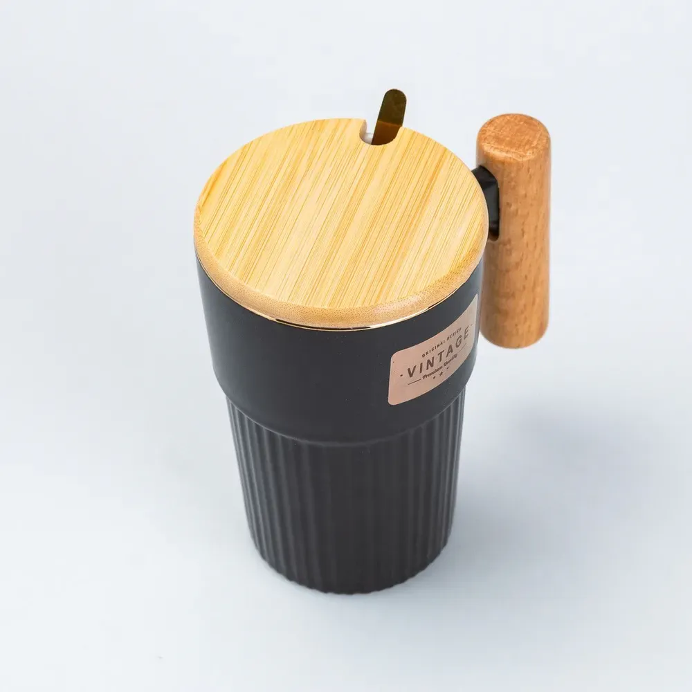Чашка керамическая с ложкой и бамбуковой крышкой 400 мл Черная (HP7205B)