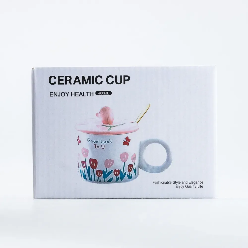 Чашка керамическая с ложкой и крышкой 300 мл. Эта красивая керамическая чашка с крышкой и ложкой однозначно станет вашей любимицей! Она неприхотливая в эксплуатации, прекрасно сохраняет тепло и подойдет как для офиса, так и для дома. наслаждаться чаем или кофе дольше.