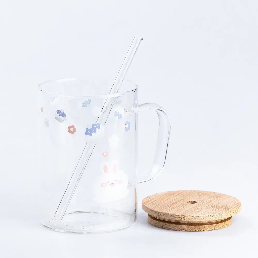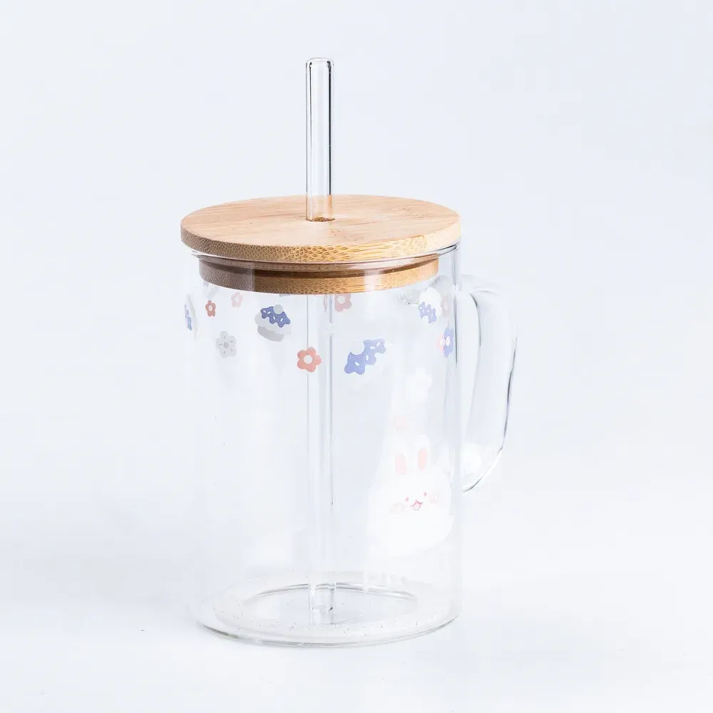 Чашка скляна 0.5 (л) з дерев'яною кришкою та трубочкою Орнамент (HP7214D)