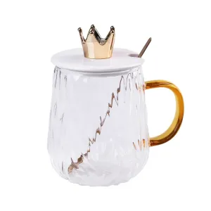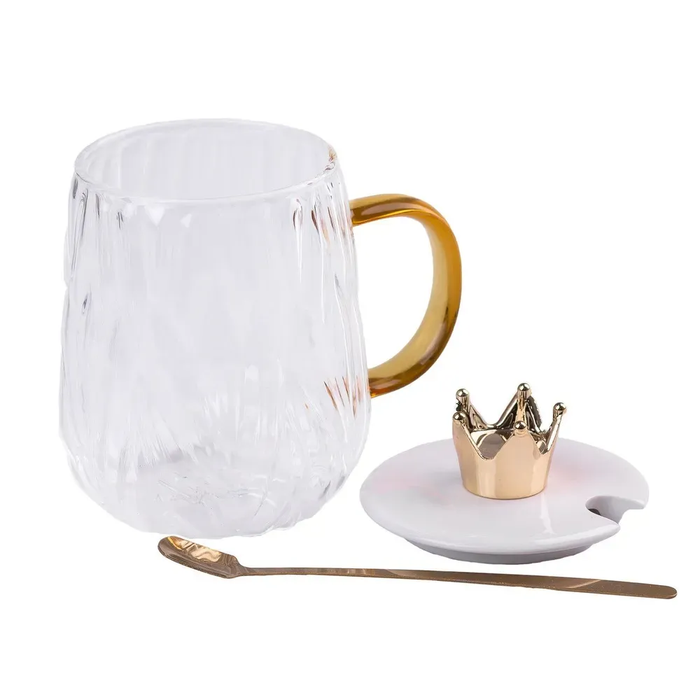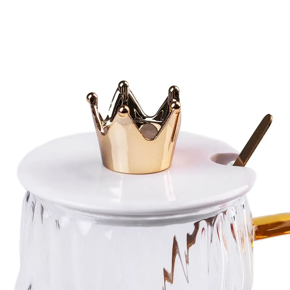 Чашка для аристократической натуры. Именно так можно сказать об этой оригинальной стеклянной кружке с чайной ложечкой. Для сохранения температуры напитка имеется керамическая крышка с ручкой в виде нагреваемой короны. Эта чашка станет идеальным вариантом и для повседневного использования, и в качестве презента на любое праздник. Чашка изготовлена из термостойкого стекла, которое не накапливает загрязнение и облегчает мойку, и имеет достаточно большой объем.