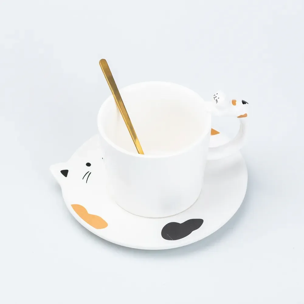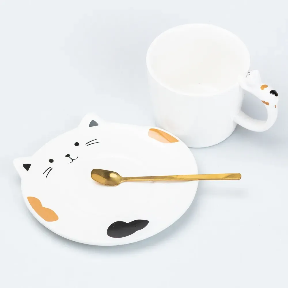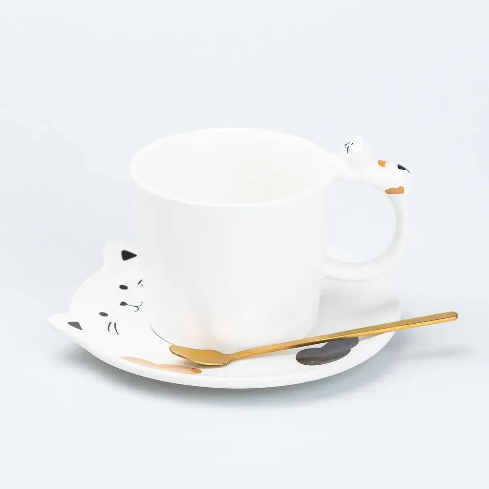 Чашка с блюдцем и ложкой керамическая 250 мл "Котенок" Белый (HP7202W)