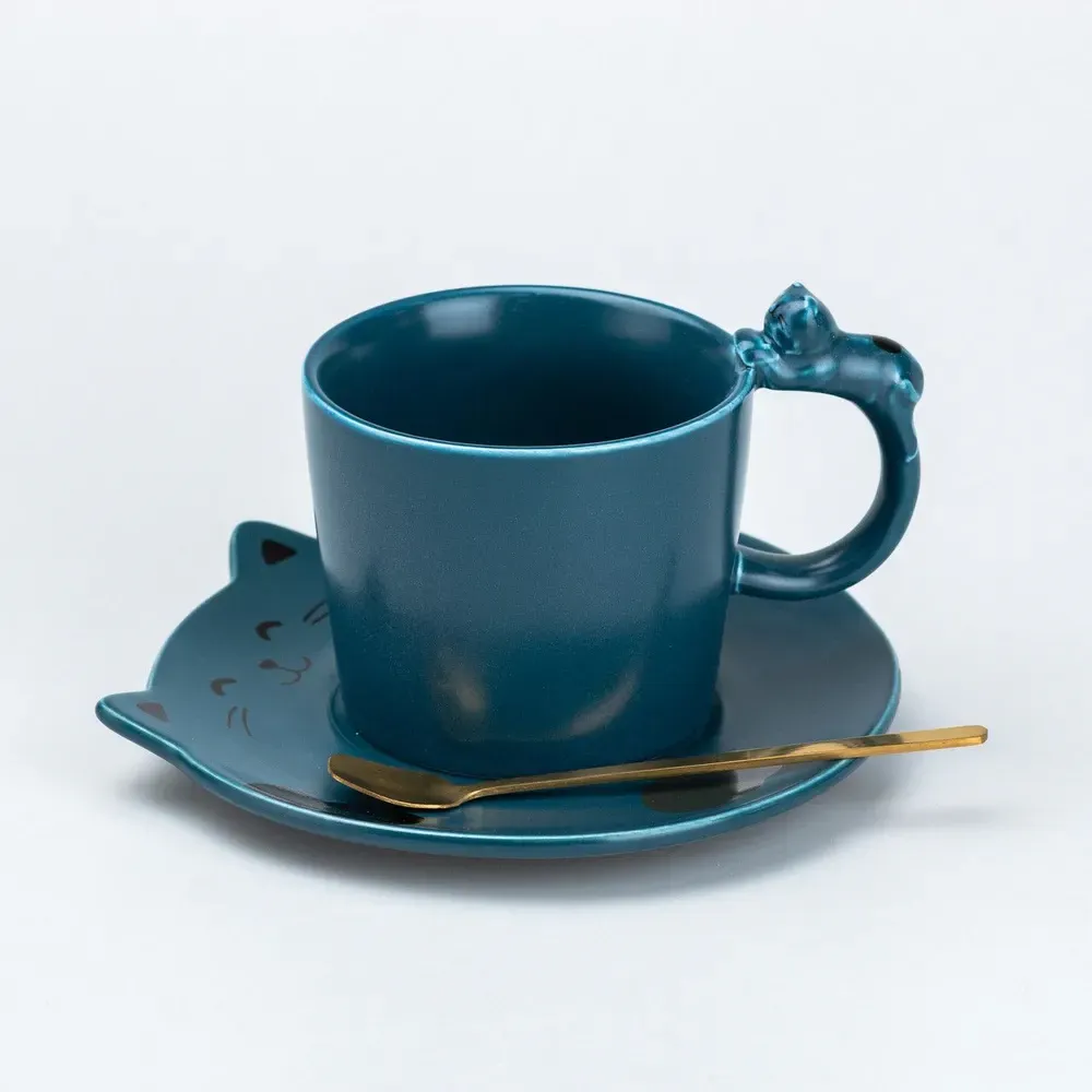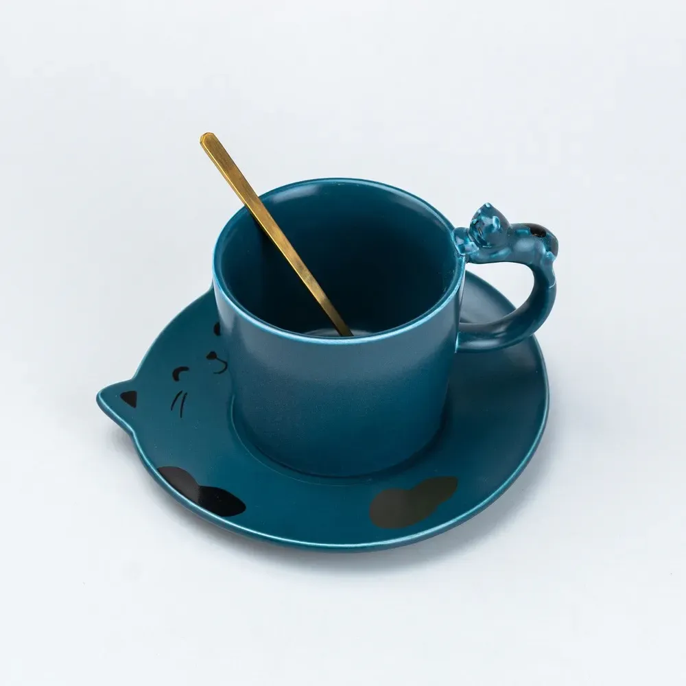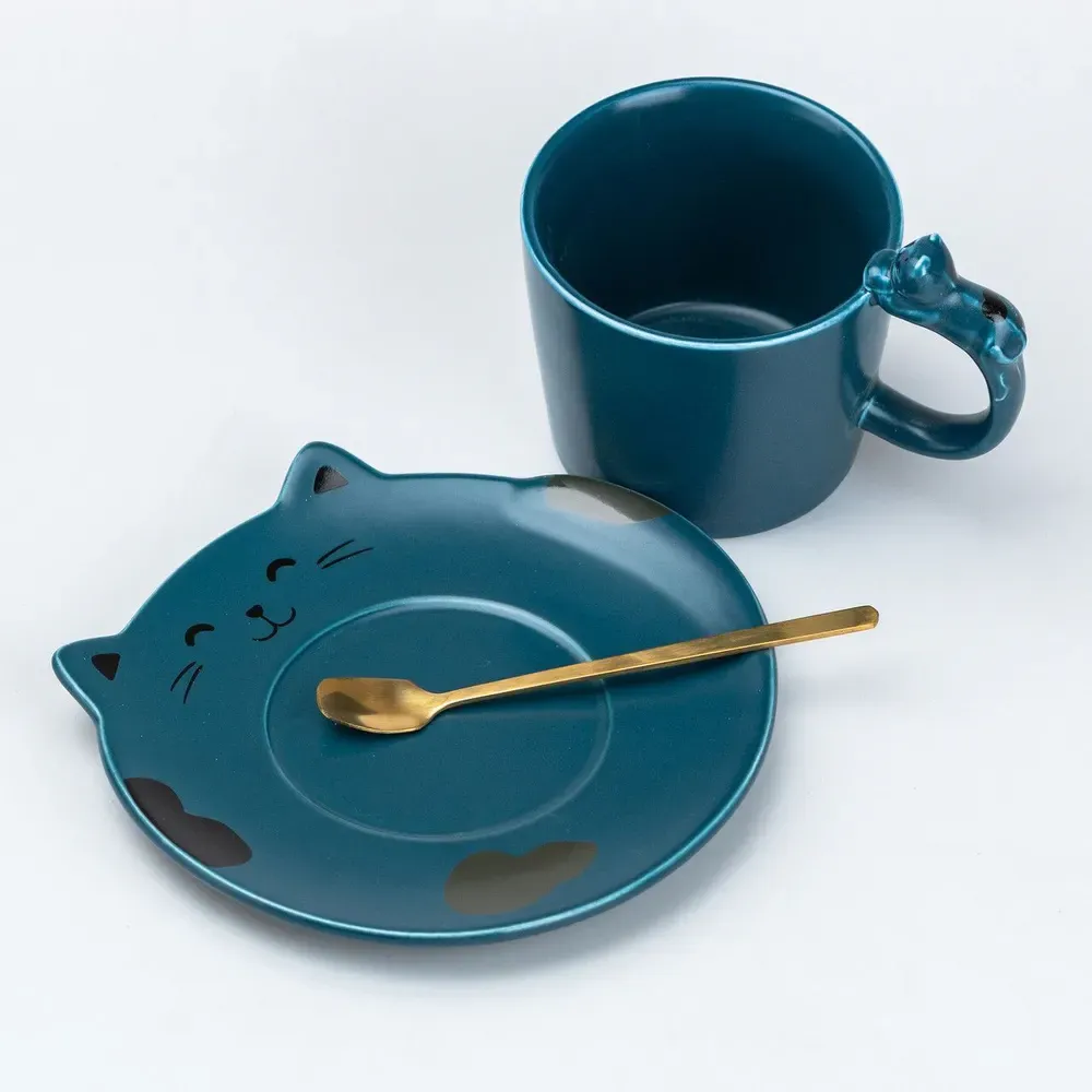 Чашка с блюдцем и ложкой керамическая 250 мл Котенок Синий (HP7202BL)