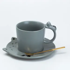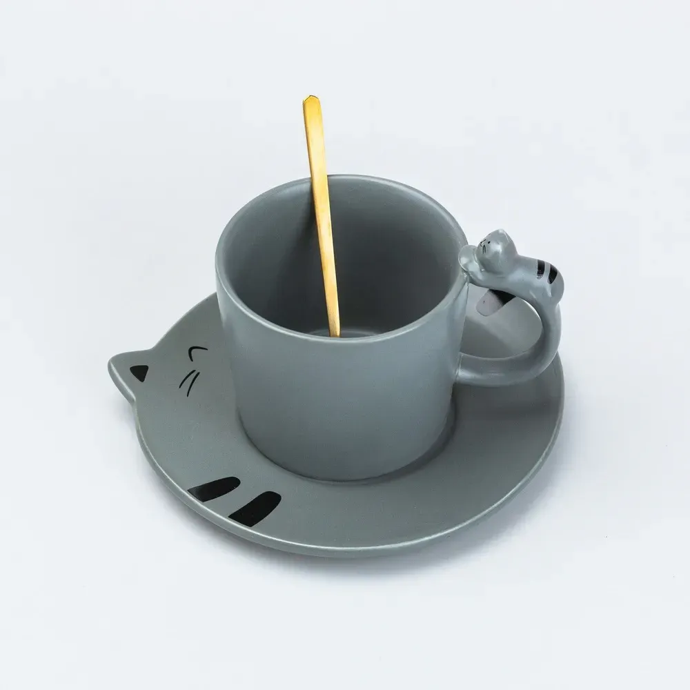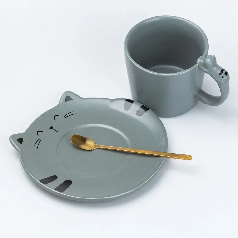 Чашка с блюдцем и ложкой керамическая 250 мл "Котенок" Серая (HP7202G)