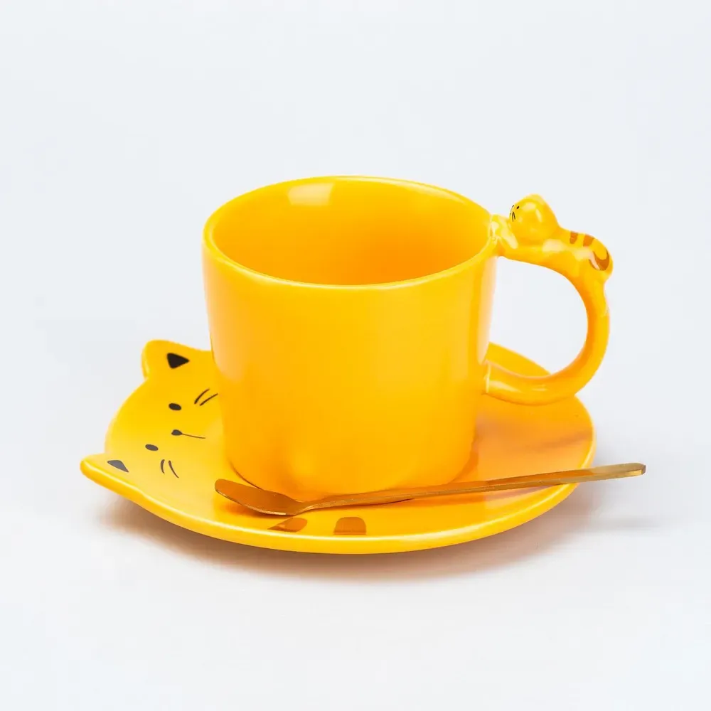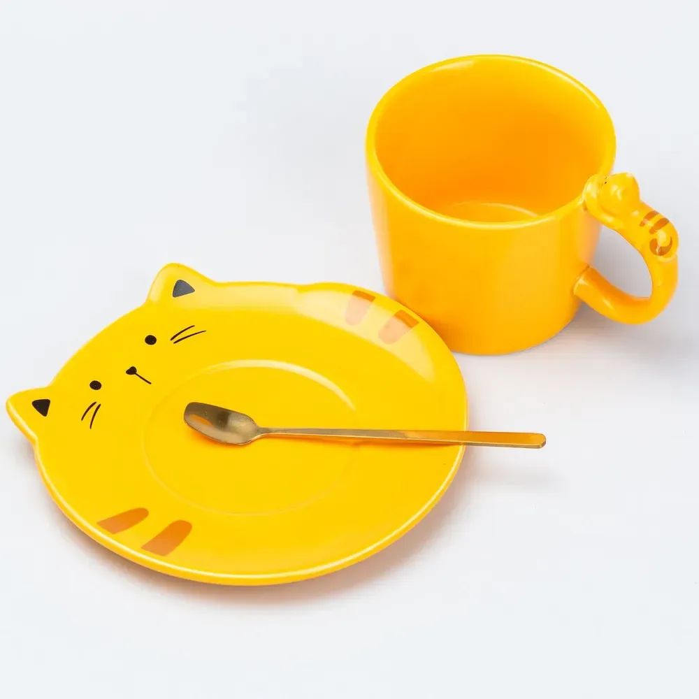 Чашка с блюдцем и ложкой керамическая 250 мл "Котенок" Желтая (HP7202Y)