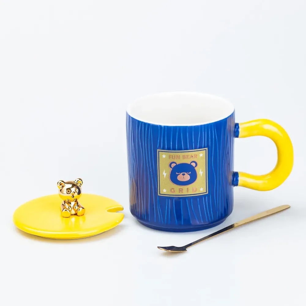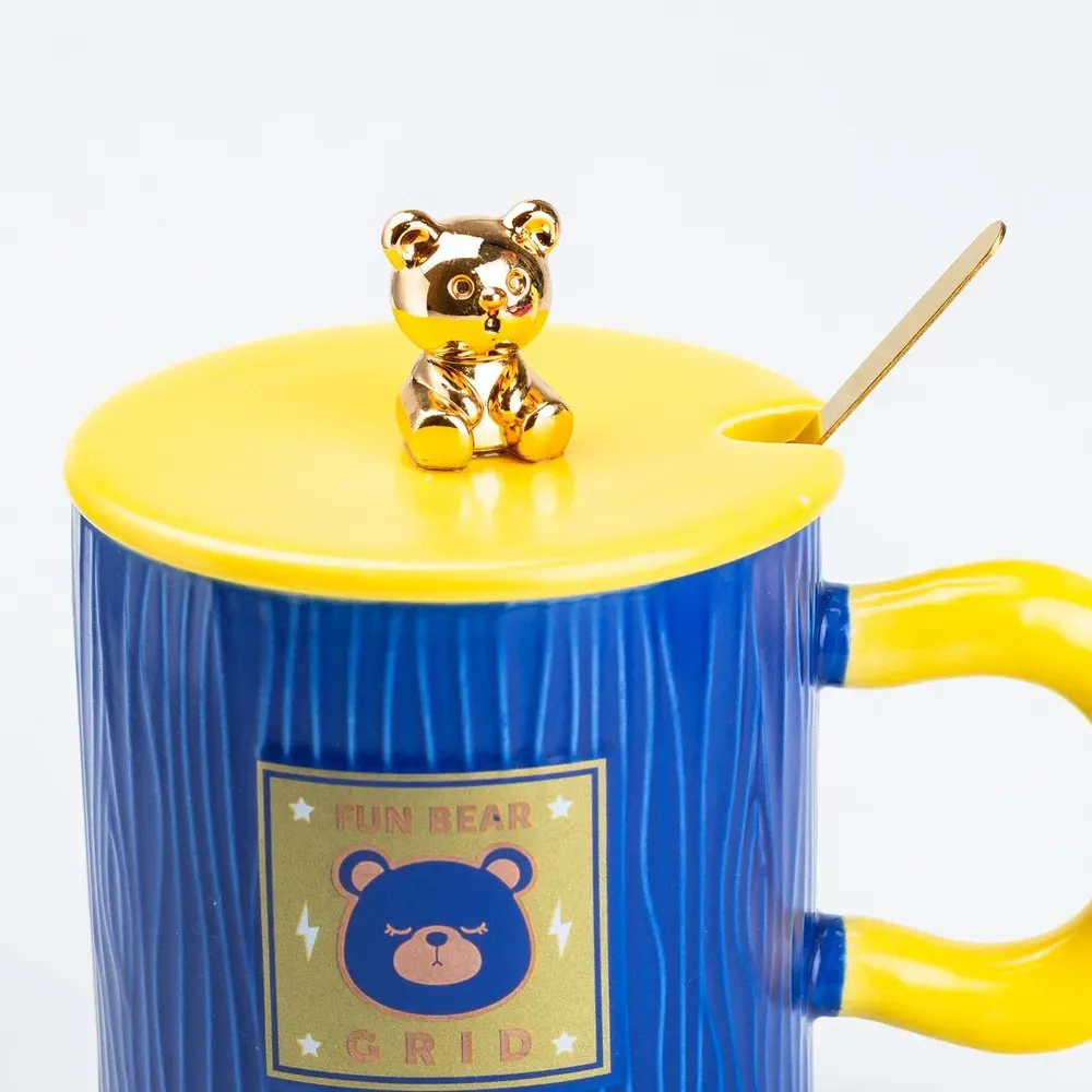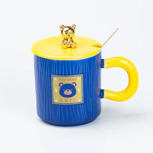 Чашка с крышкой и ложкой 300 мл керамическая Мишка Синяя (HP7198BL)