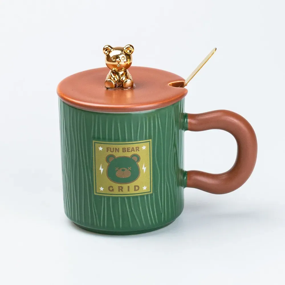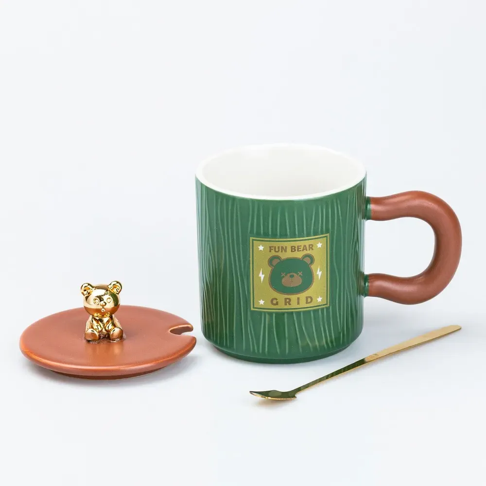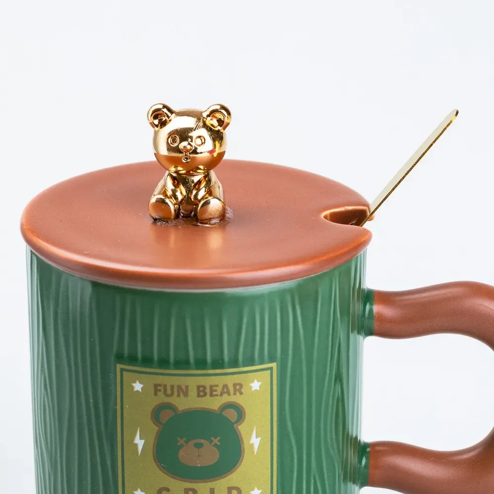 Чашка с крышкой и ложкой 300 мл керамическая Мишка Зеленая (HP7198GR)