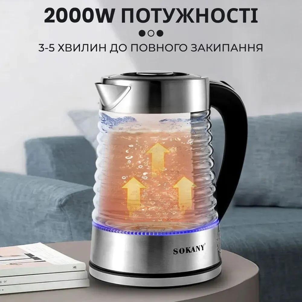 Электрочайник стеклянный бесшумный с подсветкой 2.2 л 2000 Вт Sokany SK-1027 (SK1027CST)