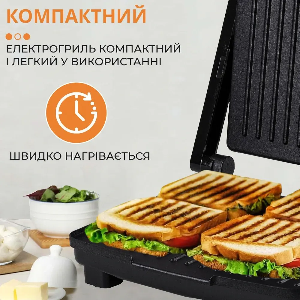 Гриль оснащен двусторонним нагреванием, что обеспечивает равномерное приготовление блюд с обеих сторон. Это делает вашу пищу хрустящей и сочной. Одна лампа показывает, что устройство нагревается, а вторая сигнализирует, что готово к использованию.