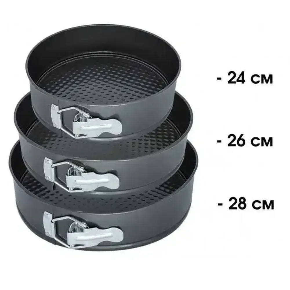 Набор разъемных круглых форм для выпечки изготовлен из качественной углеродистой стали, покрытой специальным антипригарным покрытием для комфортного использования и легкого ухода. В наборе 3 круглые формы разного диаметра. пирогов. обеспечит удобное снятие формы с коржей. Безопасное рифленое покрытие имеет антипригарный эффект и гарантирует идеальное выпекание ваших блюд.