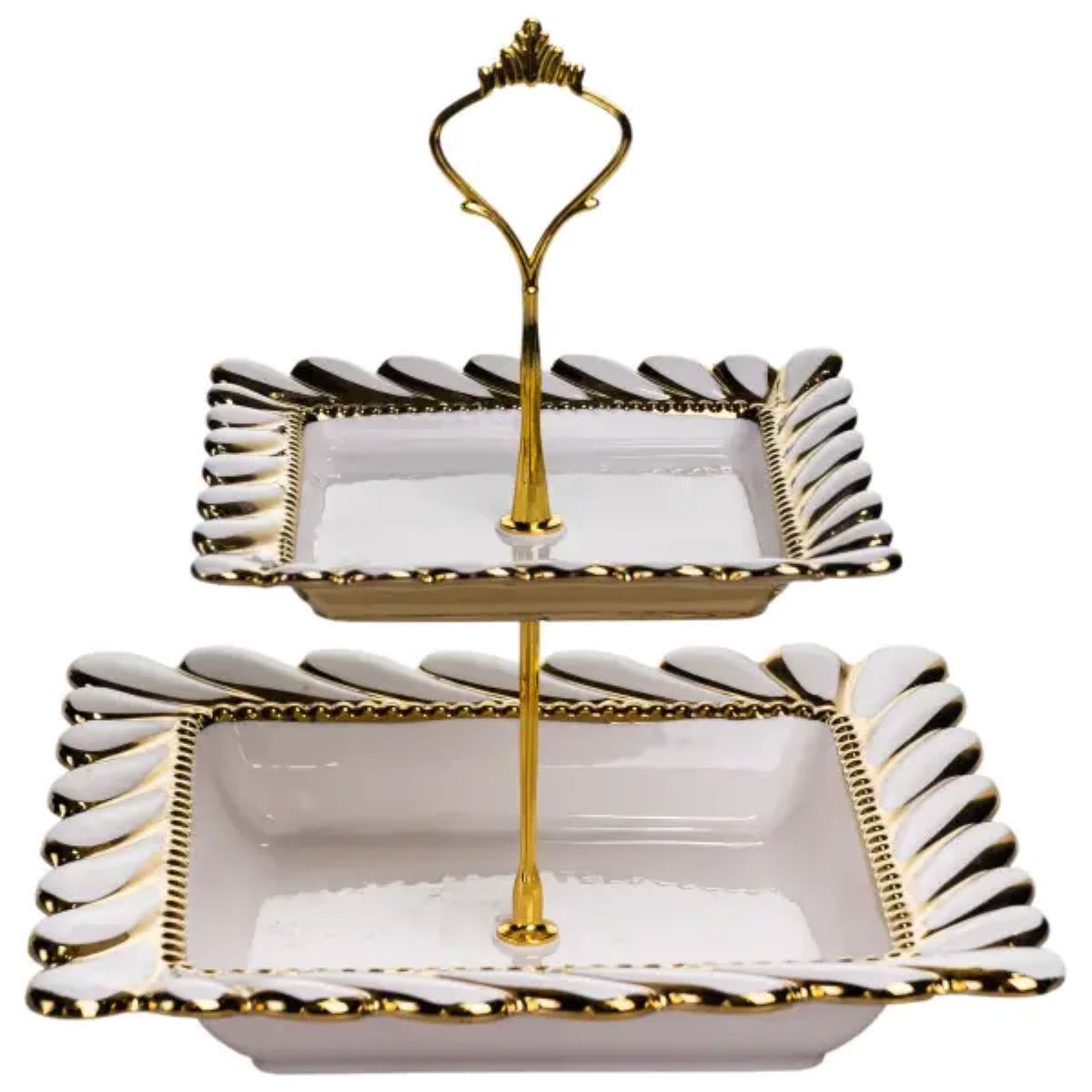 Двоярусна порцелянова фруктовниця призначена для компактного та зручного сервірування столу. Виріб складається з двох квадратних тарілок, розміщених на металевій позолоченій підставці, що забезпечує стійкість конструкції та раціональне використання простору. Формат підходить для подачі фруктів, десертів або солодкої випічки. Тарілки виготовлені з порцеляни та мають хвилястий край, форма якого нагадує пелюстки квітки. Поєднання квадратної основи з м’якими хвилястими лініями створює акуратний і збалансований вигляд. Тонка золота окантовка вздовж краю підкреслює форму тарілок і гармонійно поєднується з позолоченою металевою підставкою. Фруктовниця підходить для щоденного використання та сервірування святкового столу. Двоярусна конструкція дозволяє зручно розміщувати різні види продуктів, не перевантажуючи поверхню столу. Виріб може стати практичним елементом сервірування або доречним подарунком. Характеристики: Тип: двоярусна фруктовниця Матеріал тарілок: порцеляна Кількість тарілок: 2 Форма тарілок: квадратна Край: хвилястий Декор: тонка золота окантовка
