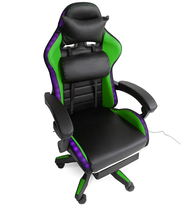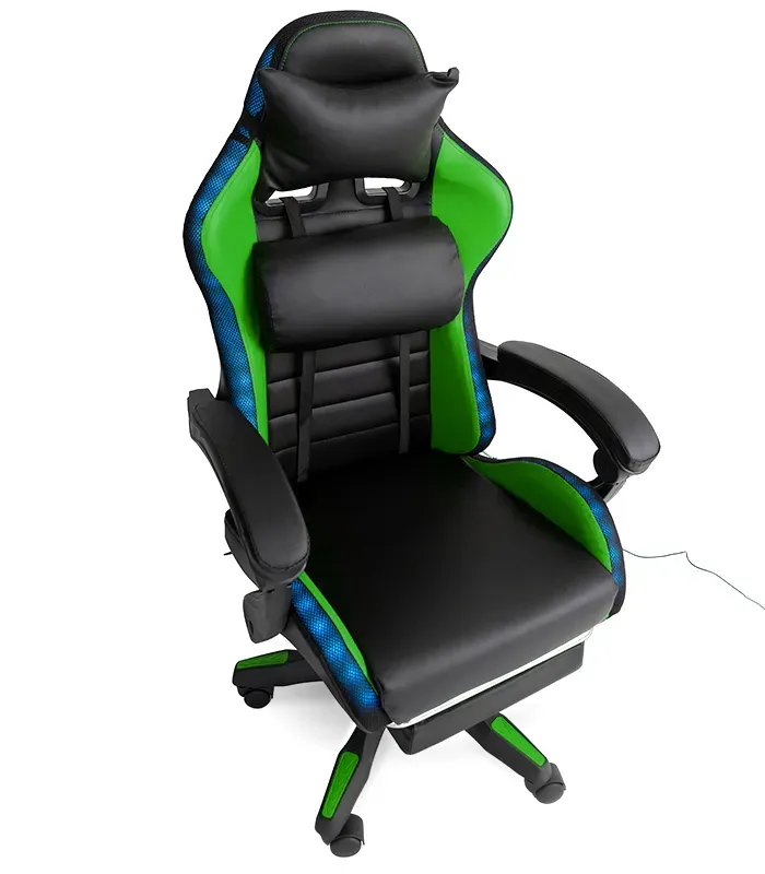 Геймерське крісло з RGB підсвіткою, подушками та висувною підставкою для ніг, Чорний/Зелений (G898)
