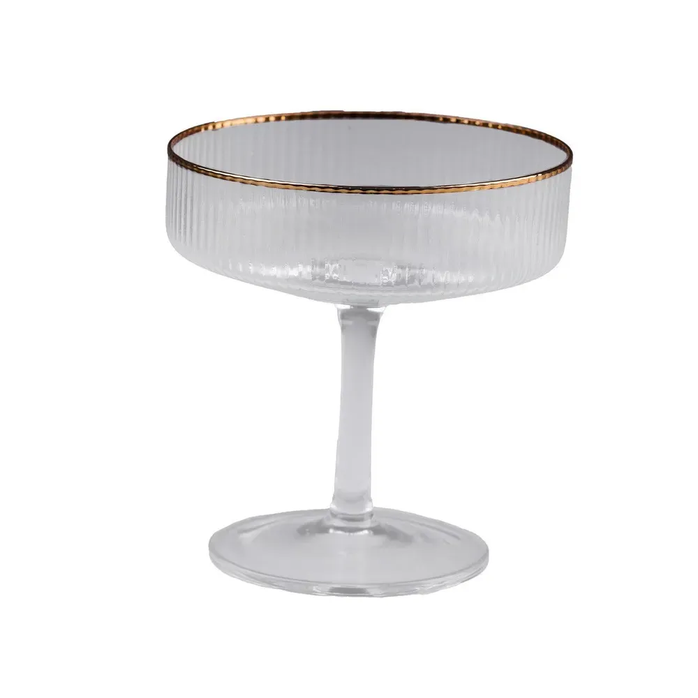 Фигурные бокалы для коктейлей, ребристые и украшенные золотым ободком, представляют собой изысканное и стильное решение для сервировки вашего стола.
